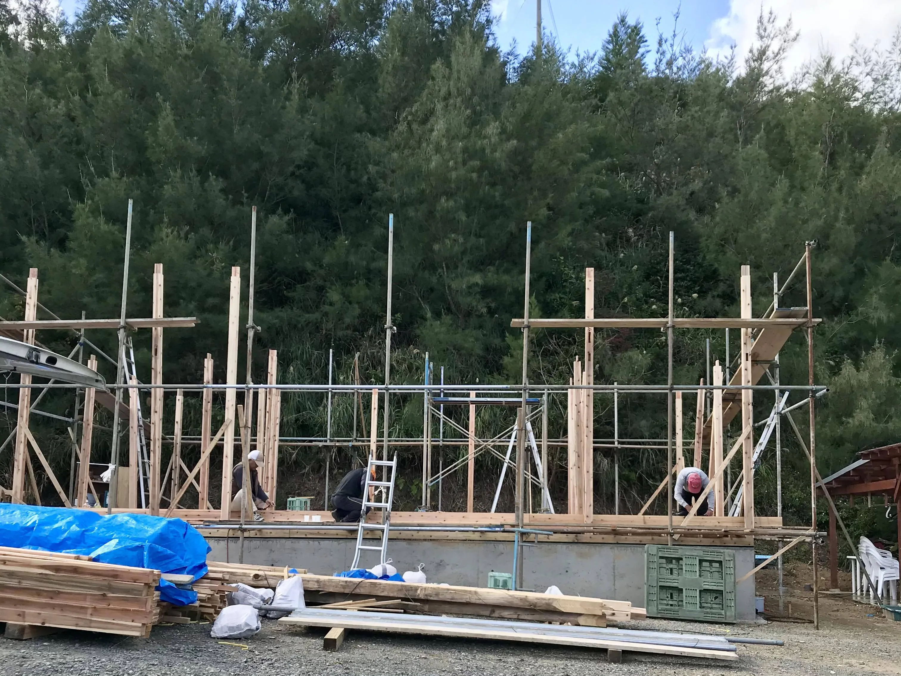 基礎工事が終わり、柱を立てているところです。