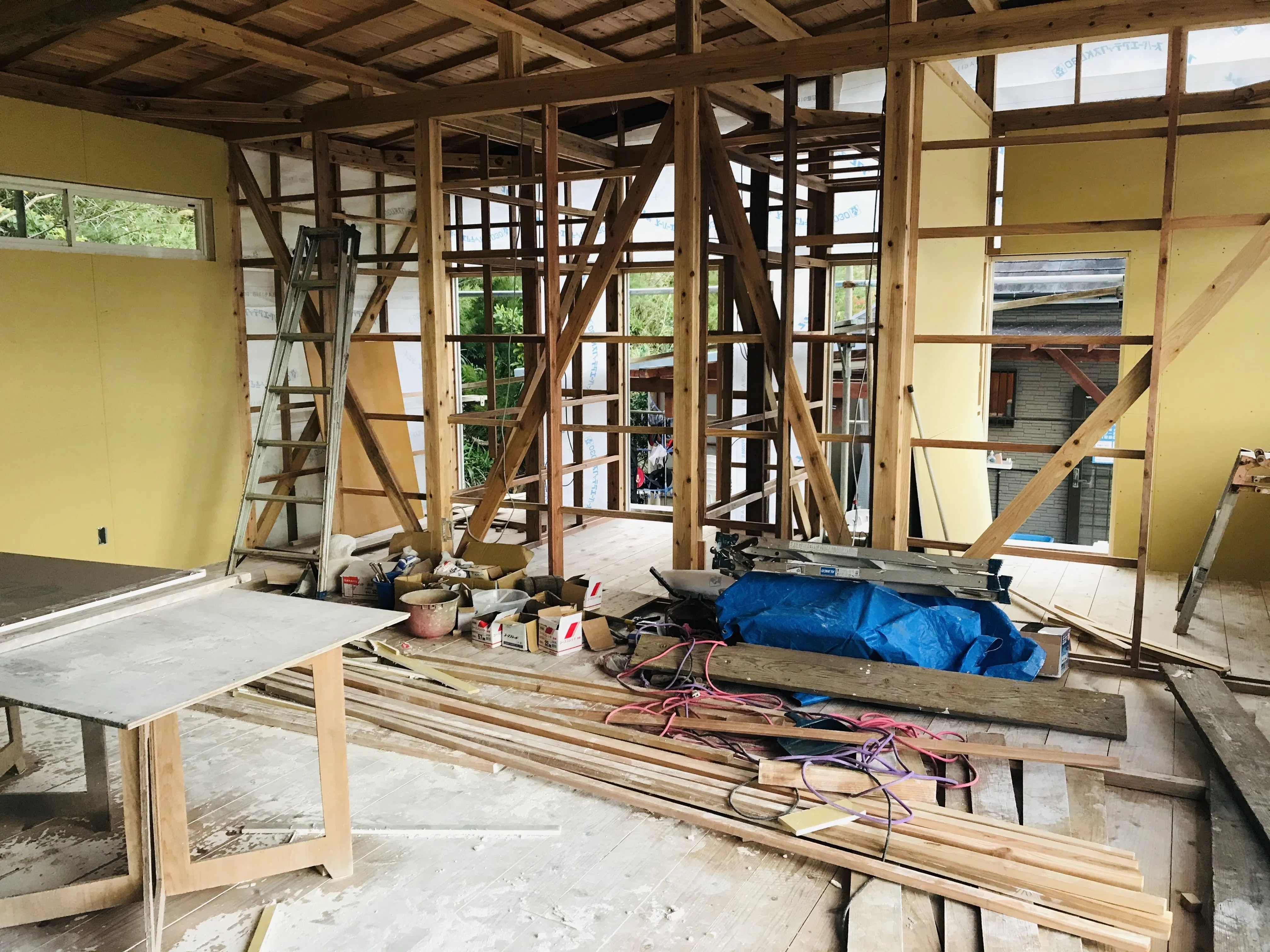 棟上げ式後、屋根が付いて柱が立ち、石膏ボードを建て始めた頃です。