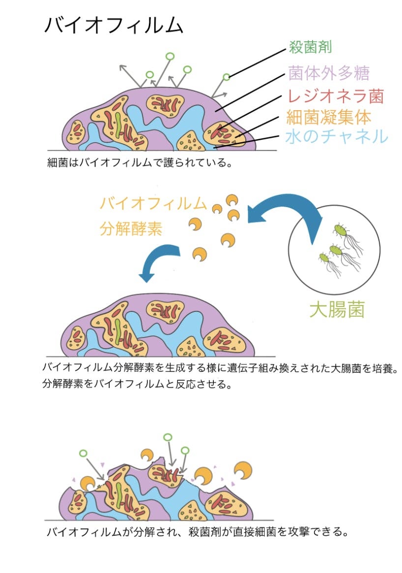 私たちはこのバイオフィルムを分解することで、温泉でのレジオネラ菌による被害を減らしたいと考えています。具体的には、大腸菌を使ってバイオフィルムを分解する酵素を作製し、塩素系薬剤による殺菌効果を上げることを目標としています。
