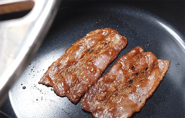 熱が入ると反り返りやすいベーコンも、フラットな鍋底に密着させる事でカリカリ食感に。