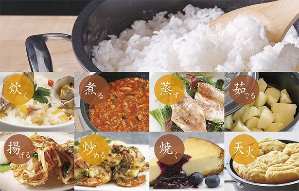 鍋1つで 炊く・蒸す・茹でる・煮る・揚げる・炒める・焼く・オーブン調理に活躍。