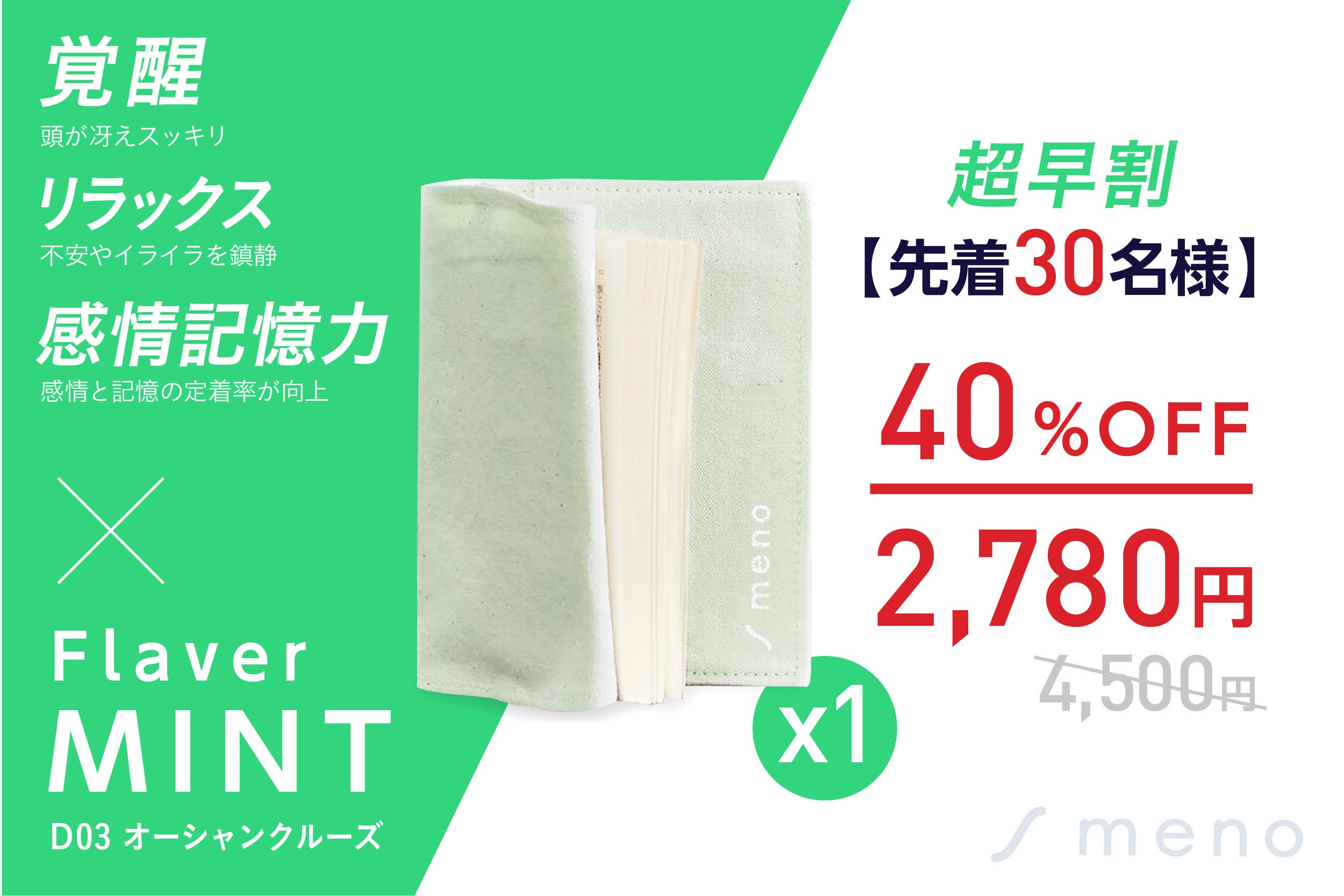 覚醒とリラックスを促す「オーシャンミント」のアロマカプセルを配合した、香るブックカバーmenoをお届けします。クラウドファンディングの先行販売に伴い、先着で超早割として、一般販売予定価格4,500円の約40%OFFとなります。