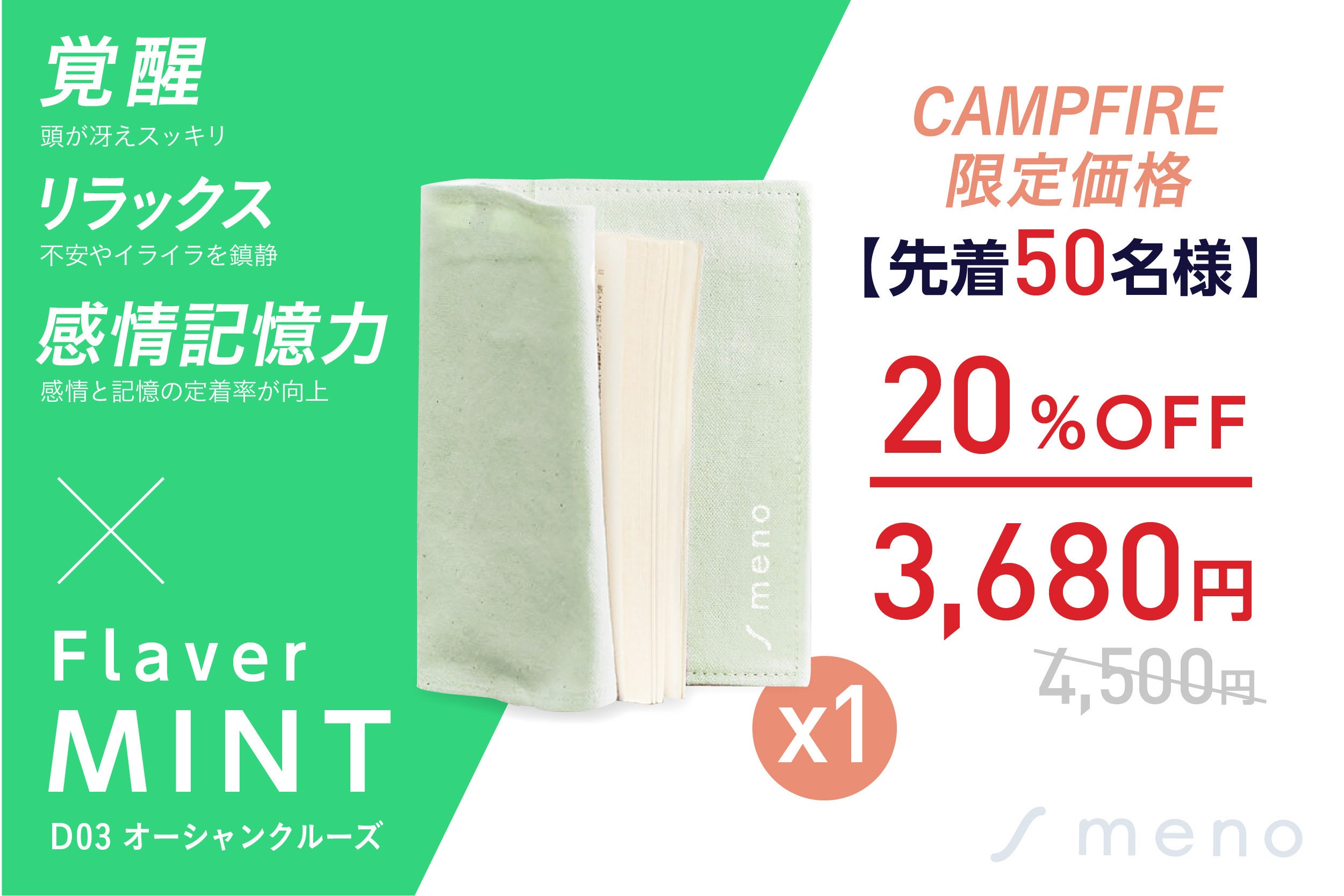覚醒とリラックスを促す「オーシャンミント」のアロマカプセルを配合した、香るブックカバーmenoをお届けします。クラウドファンディングの先行販売に伴い、CAMPFIRE限定価格として、一般販売予定価格4,500円の20%OFFとなります。