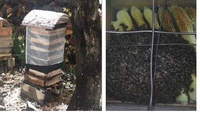 越冬期間は女王蜂を中心に体を密着させ凍死をしないように体温を保っています。通常、働き蜂の寿命は1か月程度ですが、越冬期間の寿命は3か月ほどになります。外気温が氷点下でも蜂球内は30℃前後あります。