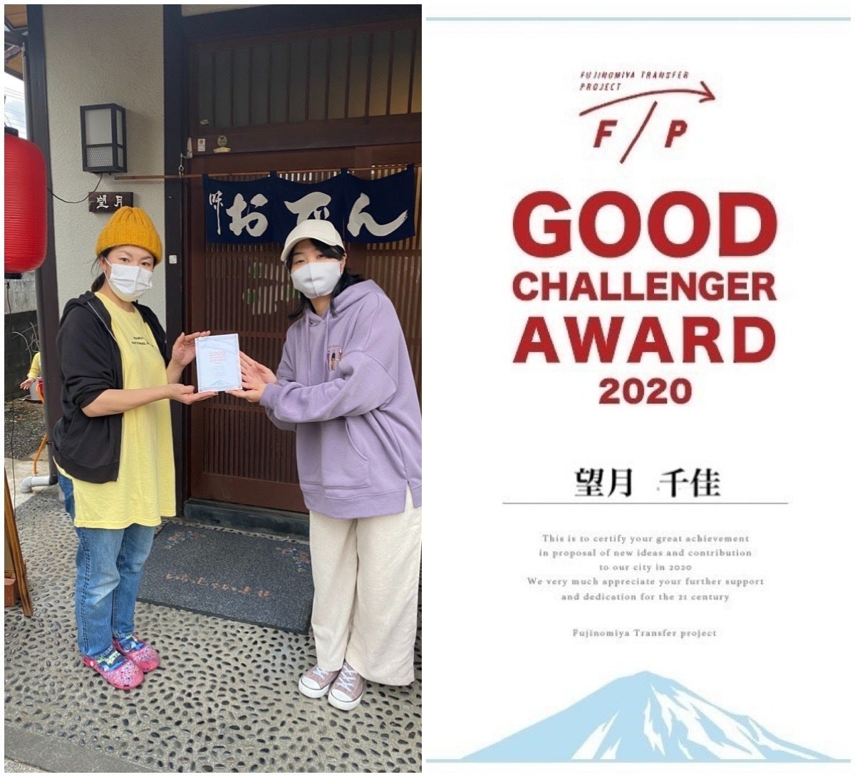 学校帰りに地域の子供が集まる場所作りをしている「あつはらおでんや」店主(写真左) 表彰の盾と市内の飲食店で使える食事券を副賞として贈呈。