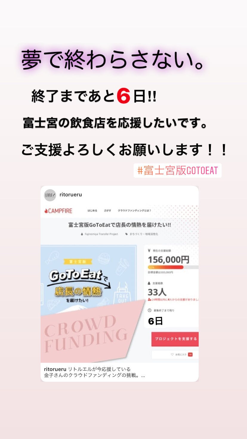 クラウドファンディング「富士宮版gotoeatで店長の情熱を届けたい‼︎」現在⚫︎支援金156,000円!⚫︎支援者数33人!⚫︎目標達成率50%!