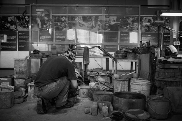 弊社の伝統工芸士・3代目清茂の雅号を持つ八重樫亮による工房での鉄瓶制作の様子