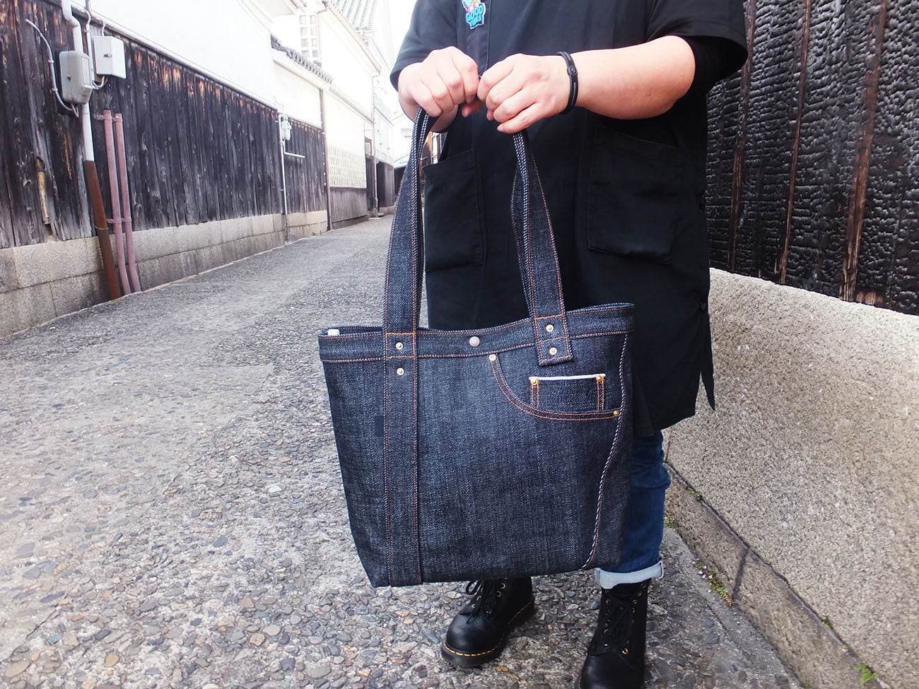 売っていない物、誰も持っていない物、定番と言うよりは希少性のある物、且つ個性あるヘビーウェイトのデニム生地を活かした、立つデニムバックを作ろうと思い立ちスタートしました。