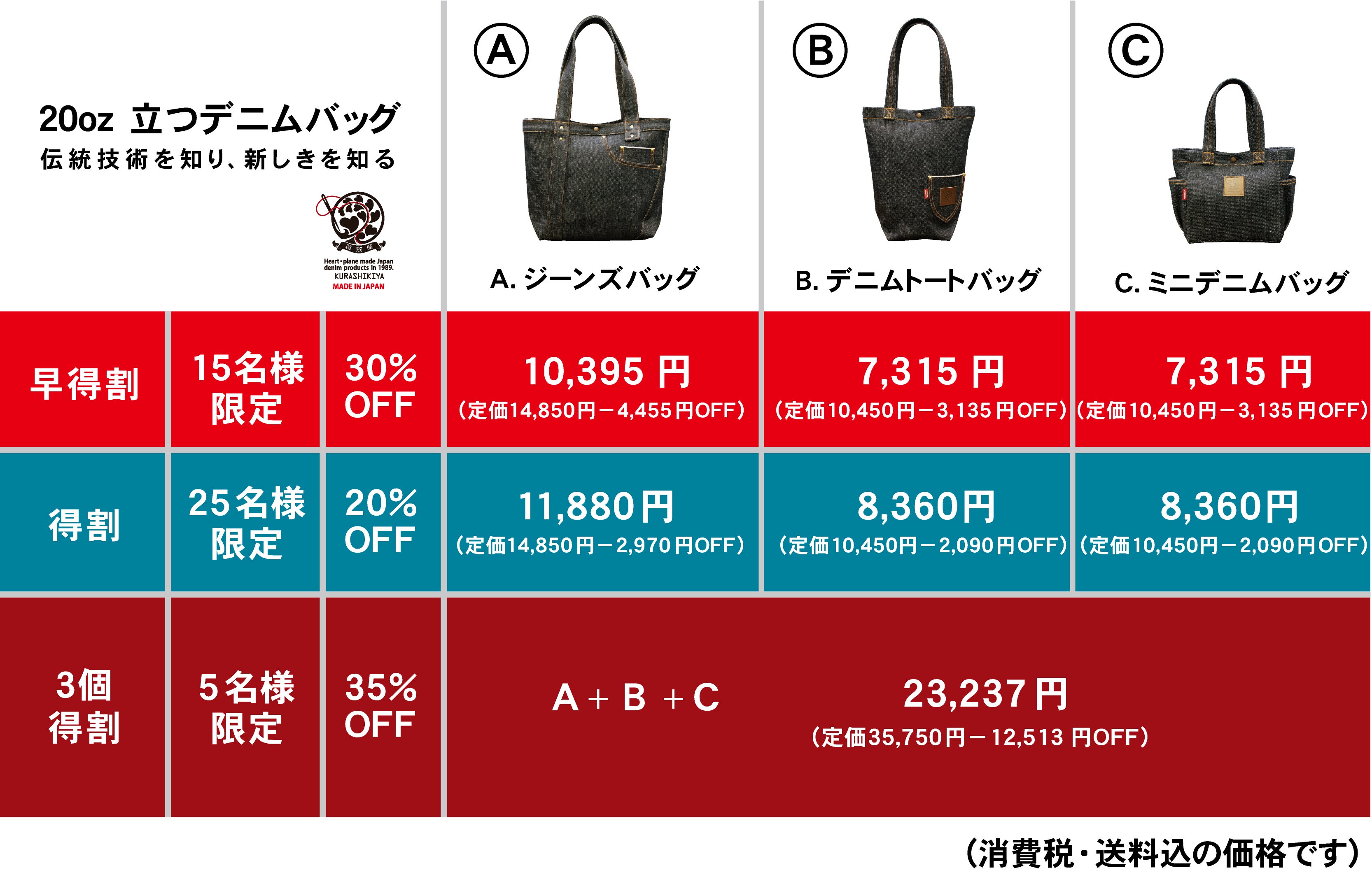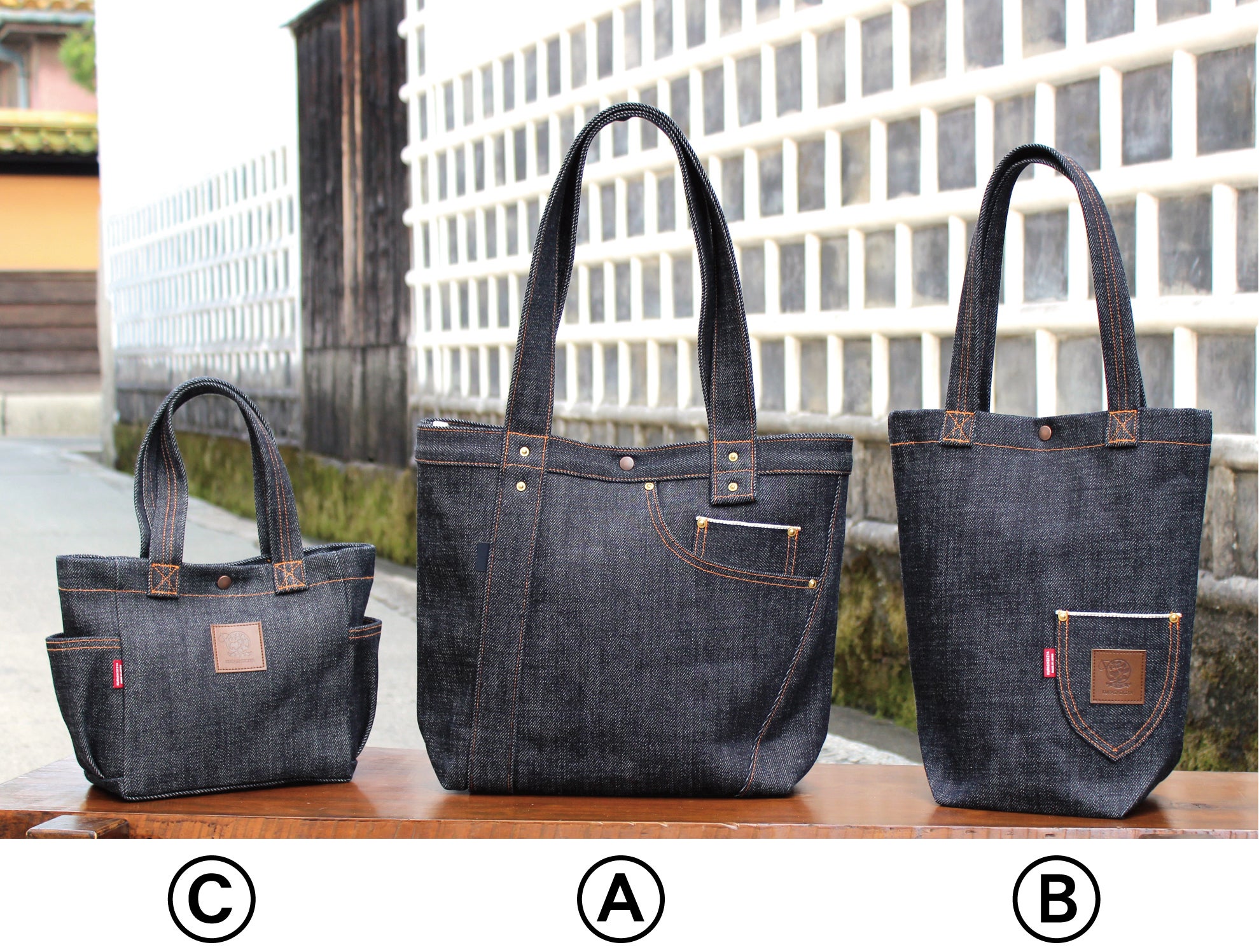 A.ジーンズバッグ、B.デニムトートバック、C.ミニデニムバックになります。