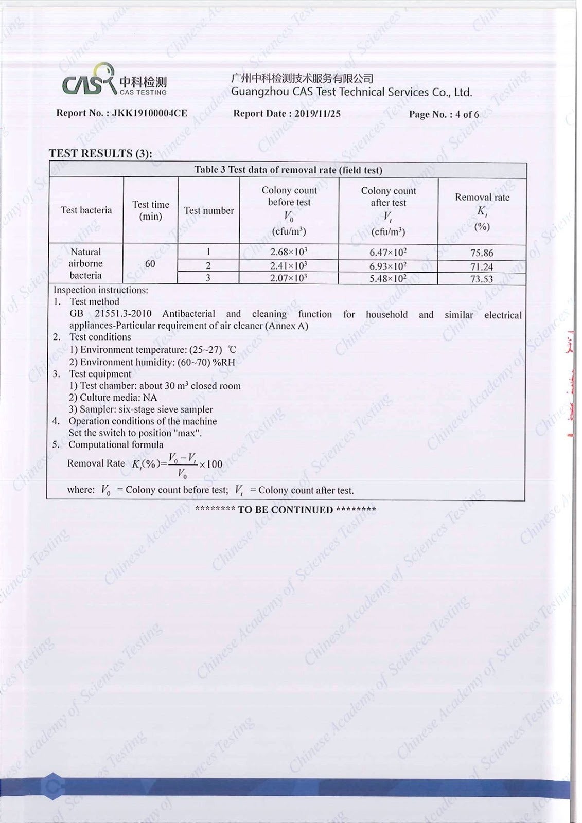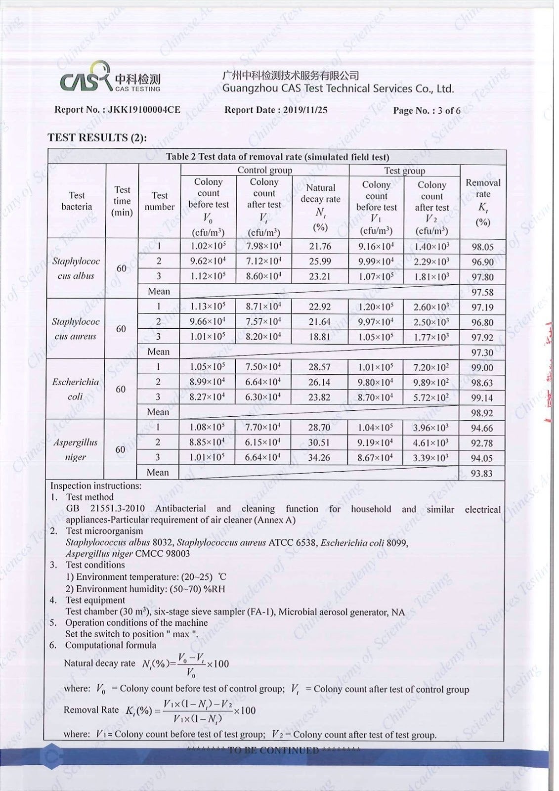 試験機関による除菌効果の試験では、空気中のバクテリアの70%以上を除去することに成功しました!