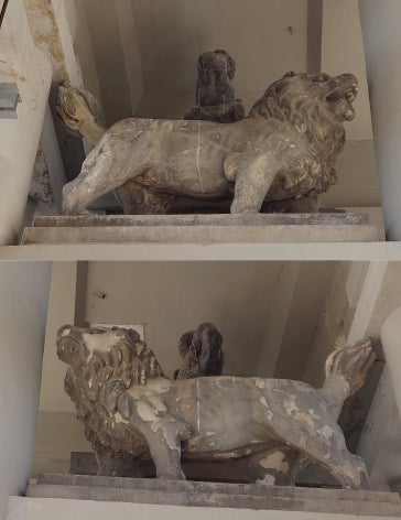 仁王像と獅子像(ライオン)はかろうじて構造的に一番強い場所であったため揺れに強く仁王像の台座に被害が出ただけでしたが高所に位置する為危険な状態に変わりはありません。