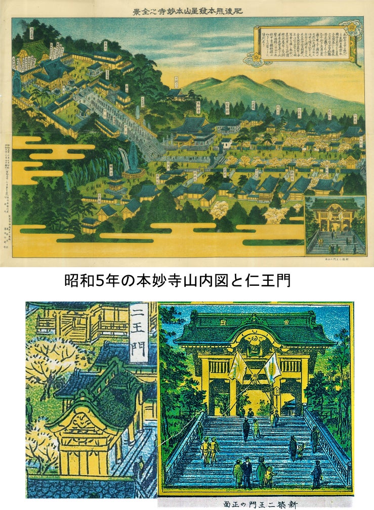 昭和5年制作の本妙寺山内図建築から10年の仁王門も新築の仁王門としてわざわざ正面からの絵が載せてある当時鉄筋コンクリート製の門として珍しかったのだろうか観光名所だったのだろう。