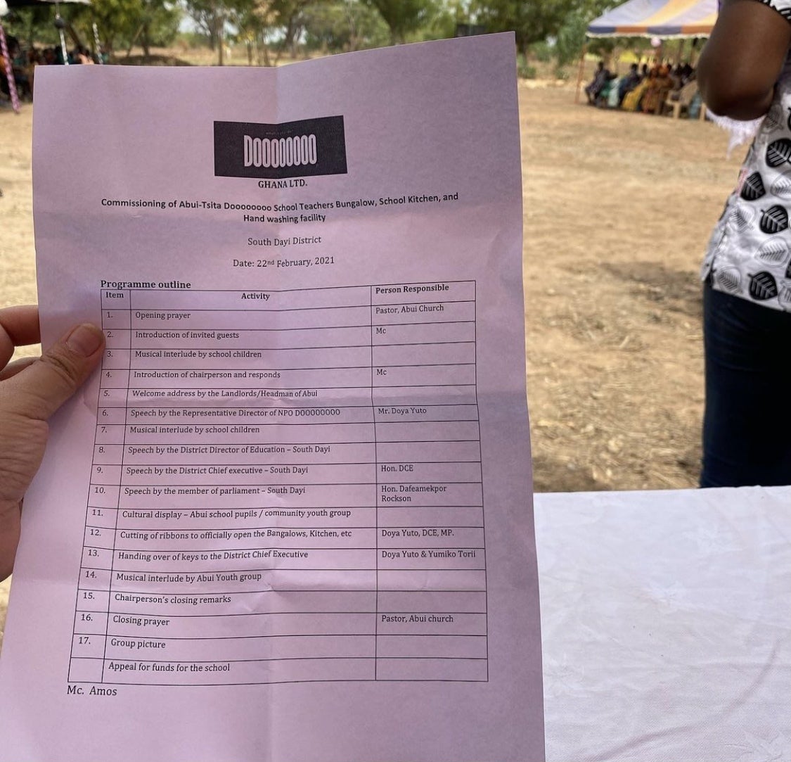 村の村長さんの挨拶から始まり、伝統ダンスの披露、教育省の方からのスピーチ、土地のオーナーさんの話、校長先生の挨拶、またダンス。演奏。