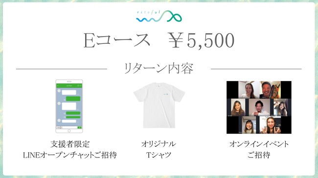 『支援者限定LINEオープンチャット招待、オリジナルTシャツ、オンラインイベント招待』