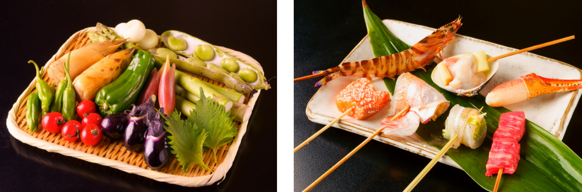 おいしい串は素材の良し悪しが一番大切です。 串の素材は厳選し、毎朝仕入れています。 四季折々の“旬”を大事に、肉、魚介、野菜を程よく混ぜながらのメニュー作り。 お客様の食欲を飽きさせる事はありません。