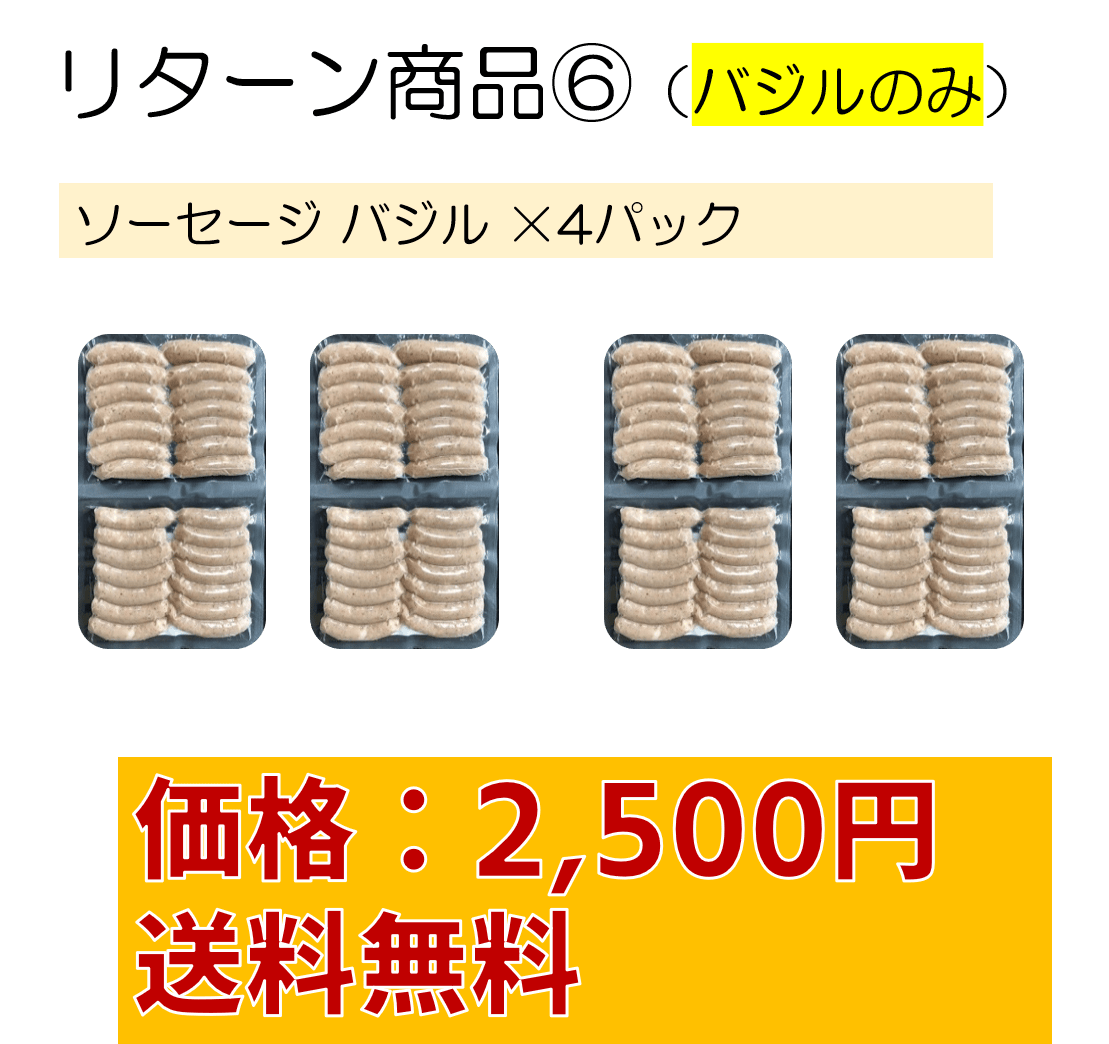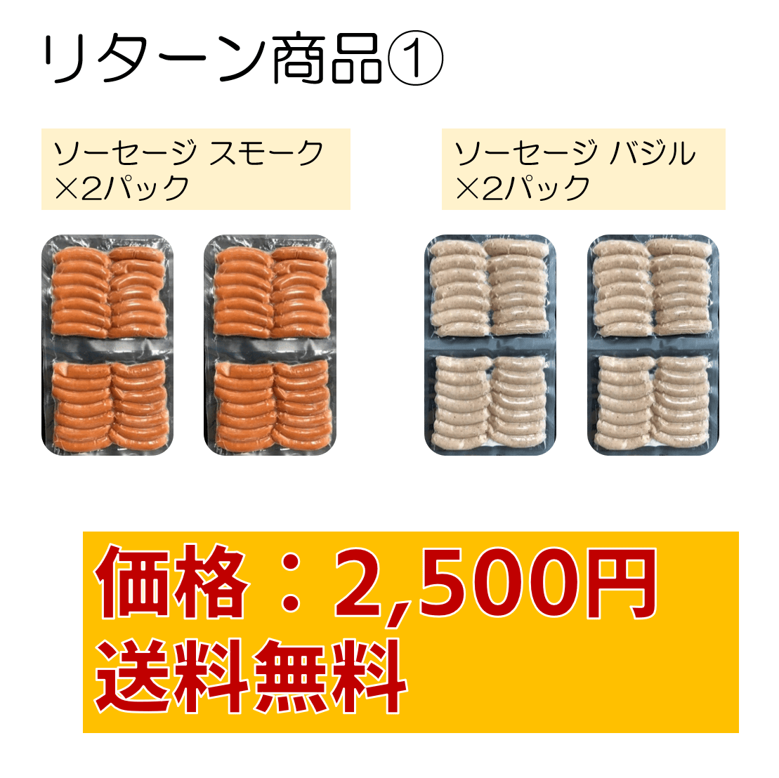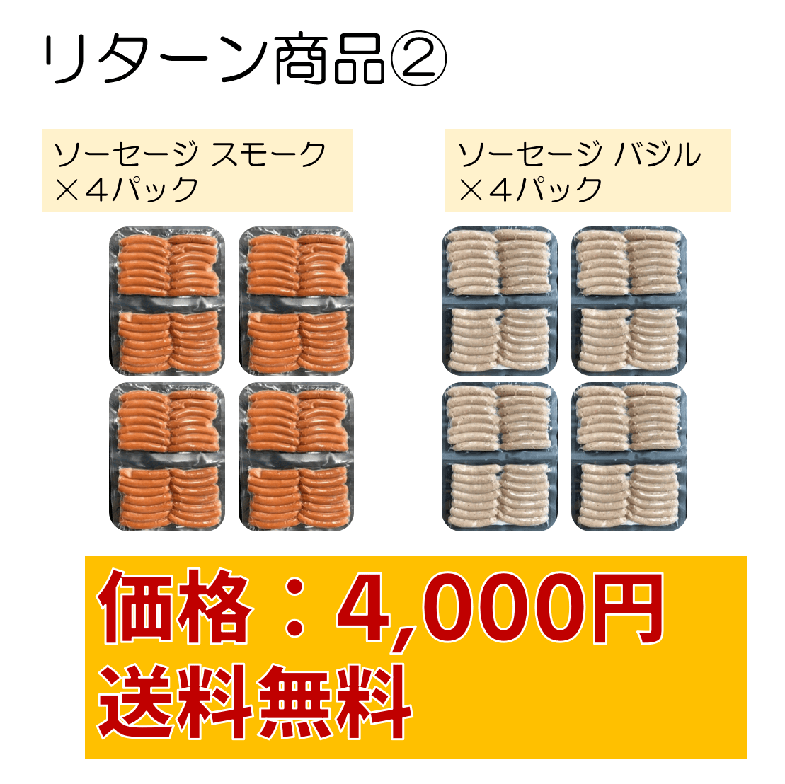 弊社が商品を卸しているお取引様での使用予定がなくなってしまったため、急遽『リターン商品④』のホワイトソーセージとバジルソーセージ各2パックのセットを再販売させて頂くこととなりました。