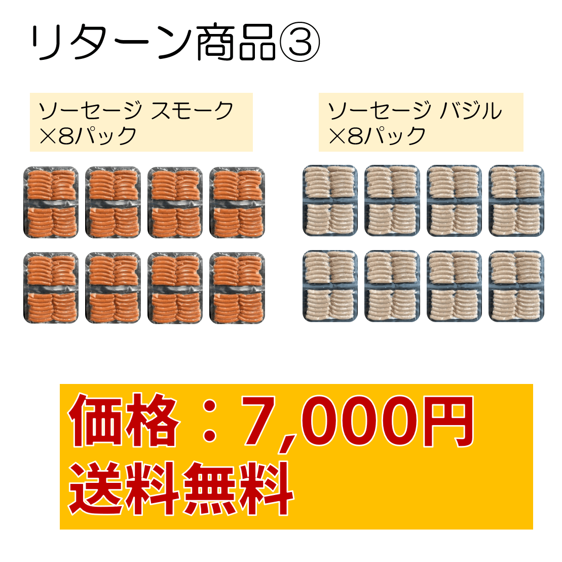 ◆ リターン商品③ ソーセージスモーク・バジル 8kg (各8パック 計16パック)
