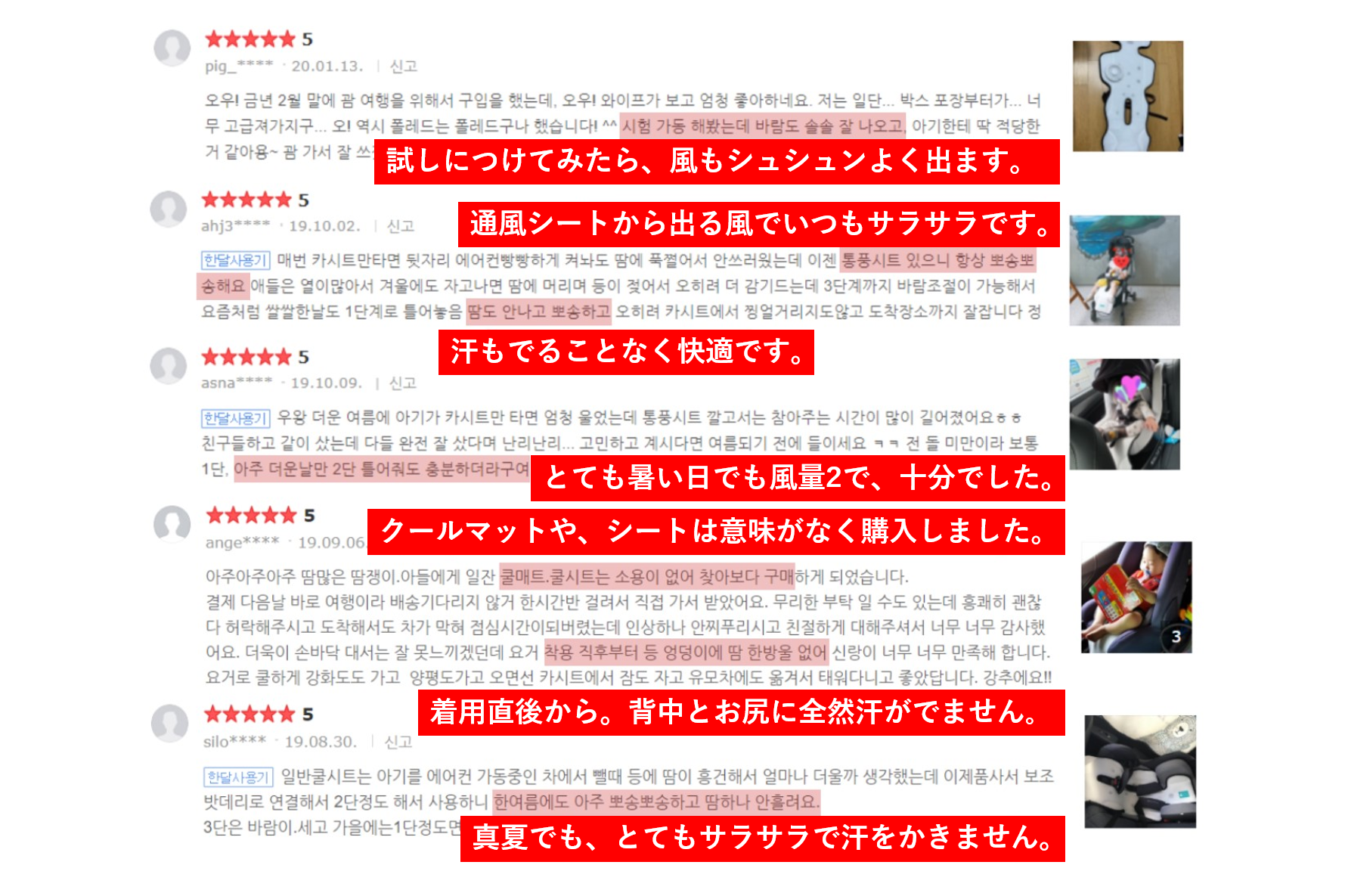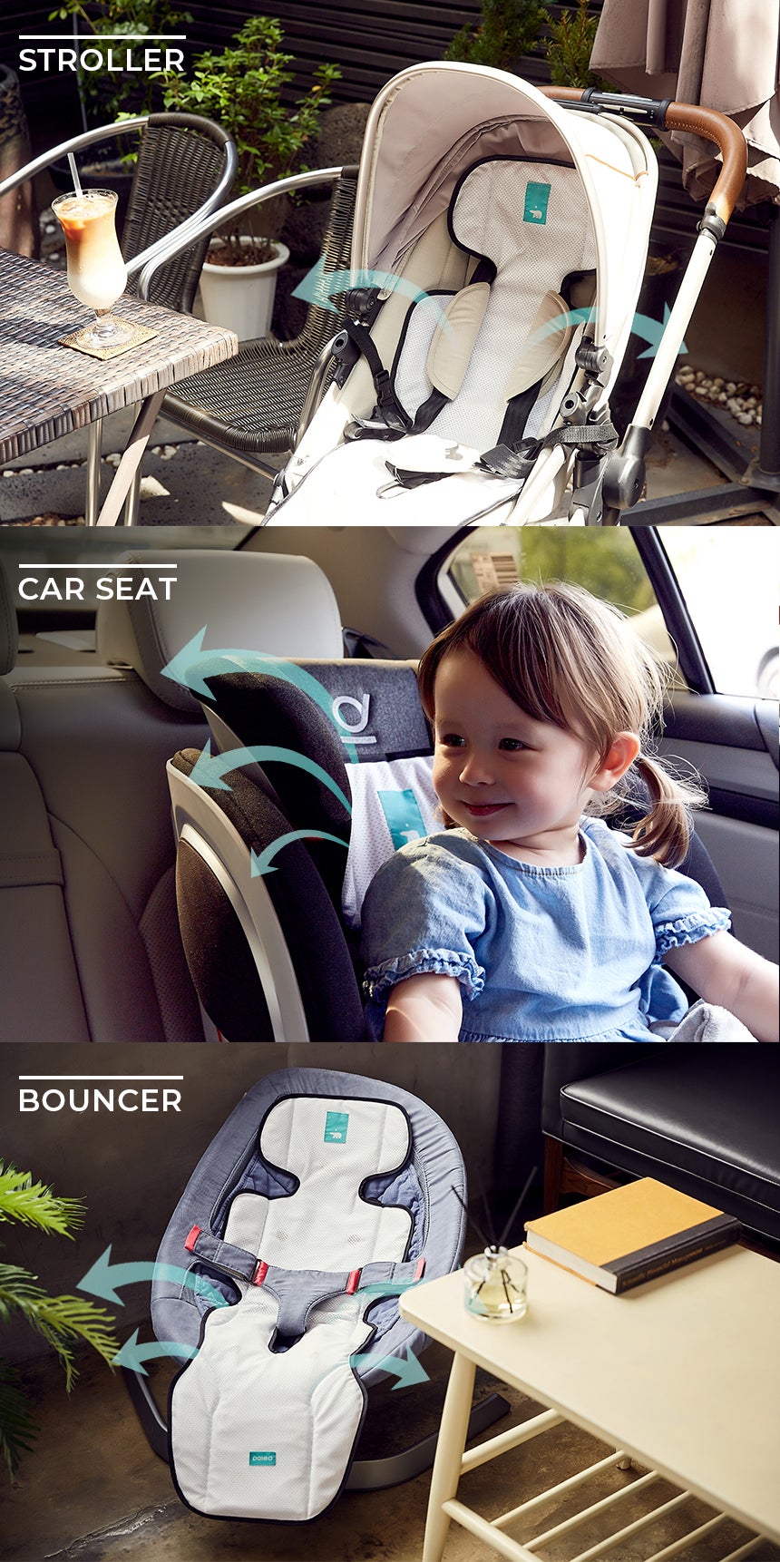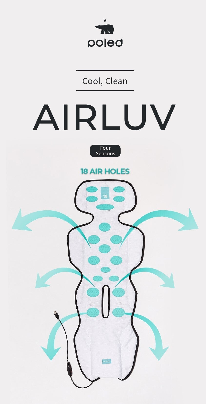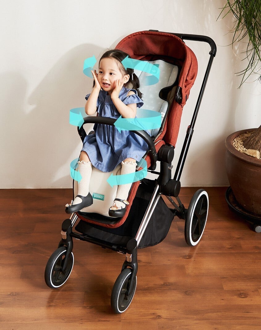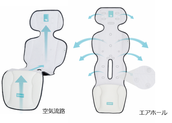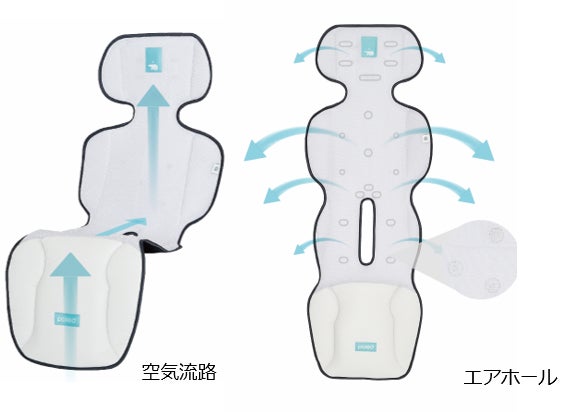背面に設計されたファンが風を通過する空間を確保し、乳児の頭から背中まで全身に涼しい風を伝達します。今までの製品の中には、ファンが前面に位置しており、またそのファンを隠すために生地を追加するので、円滑に空気を吸い込み、シート全体に空気を送り込むことが困難ものがありました。