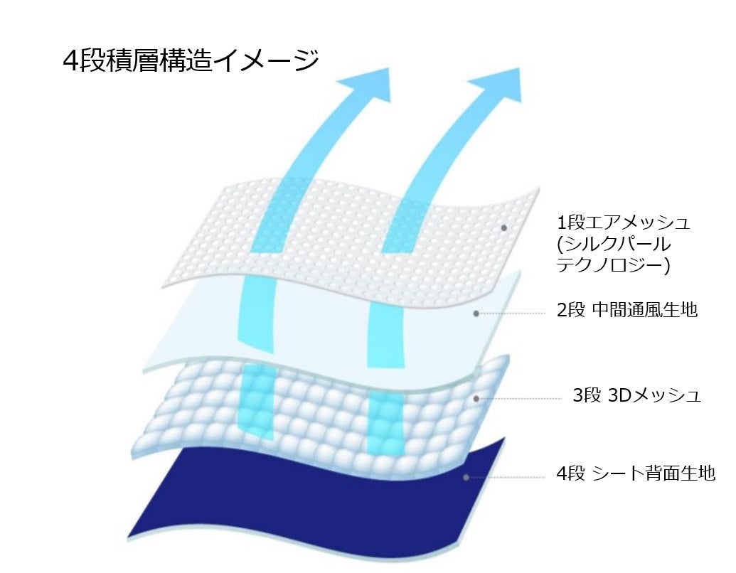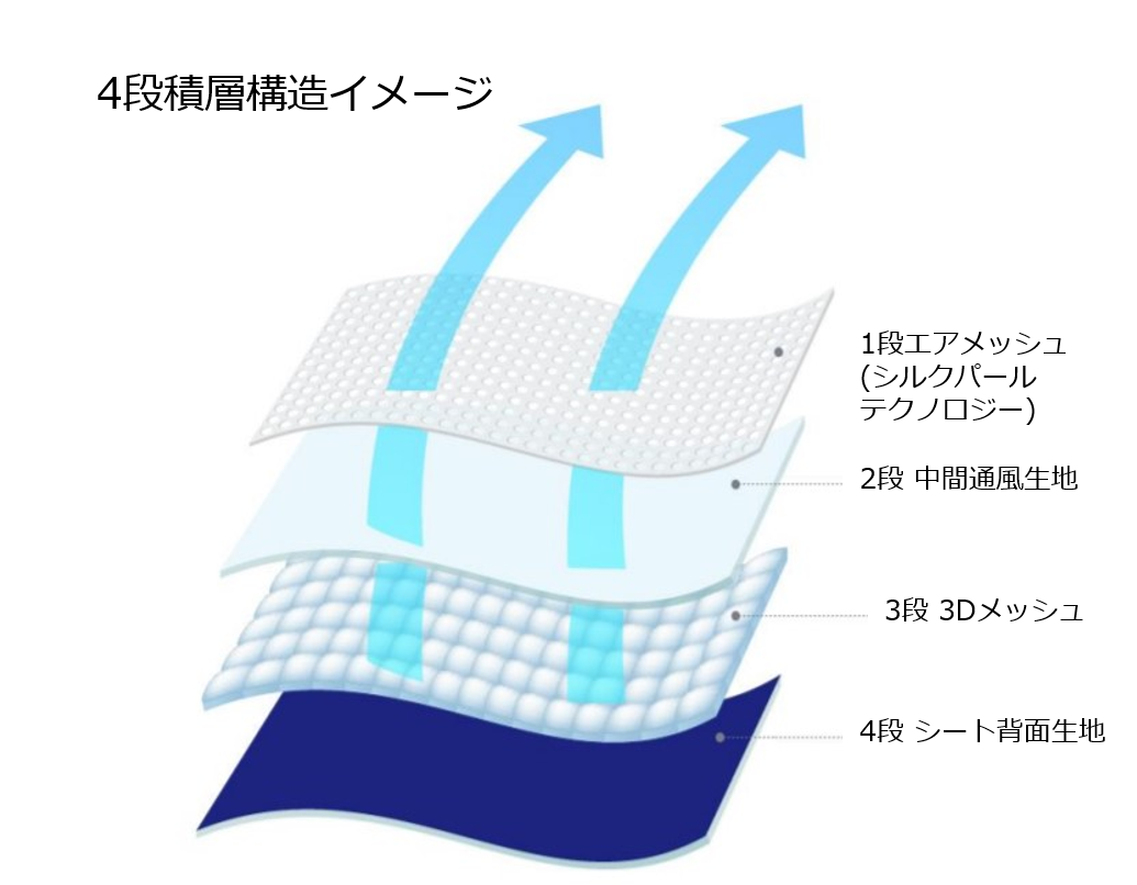3段:(3Dメッシュ):3次元立体織物で空気の循環がスムーズで汗を素早く冷やして、復元力にもすぐれているために、柔らかなクッション性があり、居住空間を快適にする役割があります。