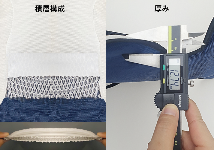 従来のメッシュ生地と比較して従来の生地よりも1~2mmほど厚さが増したことにより、クッション感が向上しました。また従来と比べてより細かくなったメッシュ素材で優れた復元力を提供します。