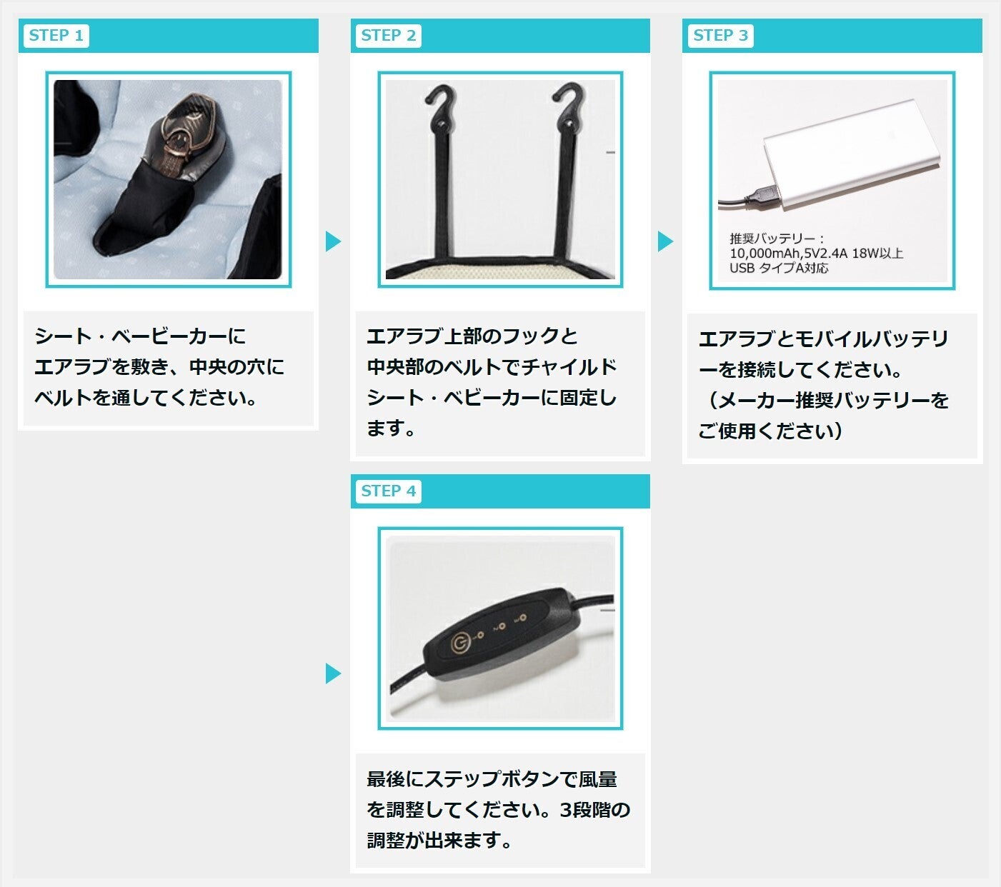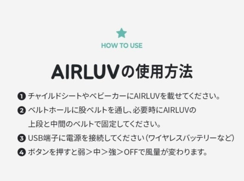 エアラブはわずか1.1kgだから持ち運びも楽々。しかもモバイルバッテリーを使用。ベビーカー・チャイルドシート・ゆりかごはもちろんのこと、暑さや蒸れが気になるところに気軽に持ち歩いてお出かけできます。