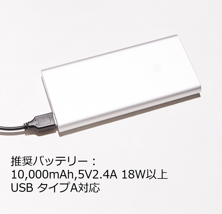 モバイルバッテリー(別売)は バッテリー容量:10,000mAh 出力:5V2A 18W以上を推奨しています。またコネクタータイプは USB-Type A 対応のモバイルバッテリーをお使いください。