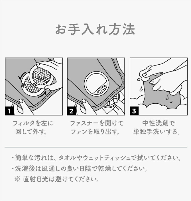 *2 簡単な汚れには乾いたタオルやウェットティッシュで表面を拭いたり、はたいてください。ただし、液体などの汚れがエアラブのファンの内側に入り込んだ場合は、ファンを十分に乾かしてから使用してください。