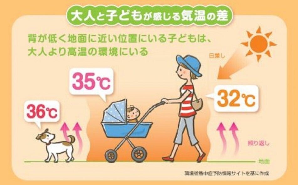 実際に、1.5mの気温が32.3℃でも、50cmの高さでは35℃を超えることもあるそうです。ベビーカーを押す両親よりも子どもが感じている気温ははるかに高いということになります。