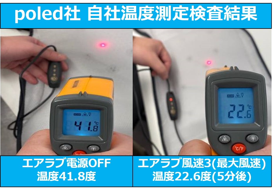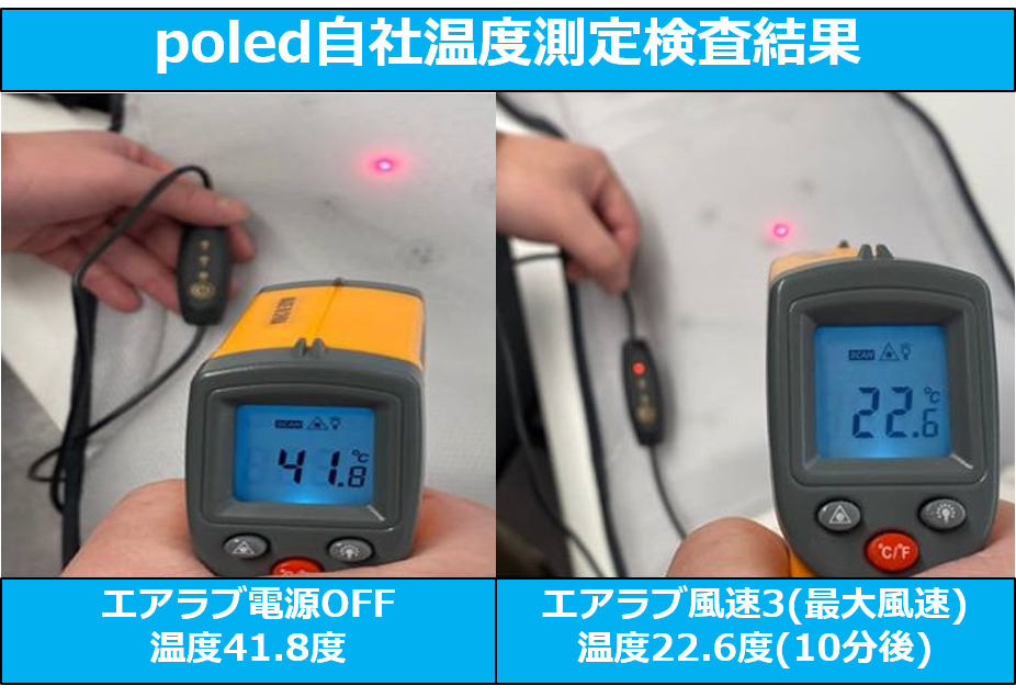 さらにpoled社の社内測定実験でシートの表面温度の検査をしたところ、5分でシートの表面温度が約20度下がりました。