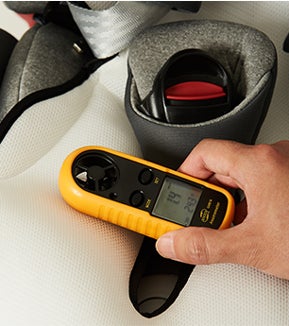 頭部の両サイドのクッション構造は、お子さまの大切な首を守ります。車載チャイルドシート開発のためのクラッシュテストの経験がエアラブには活かされています。