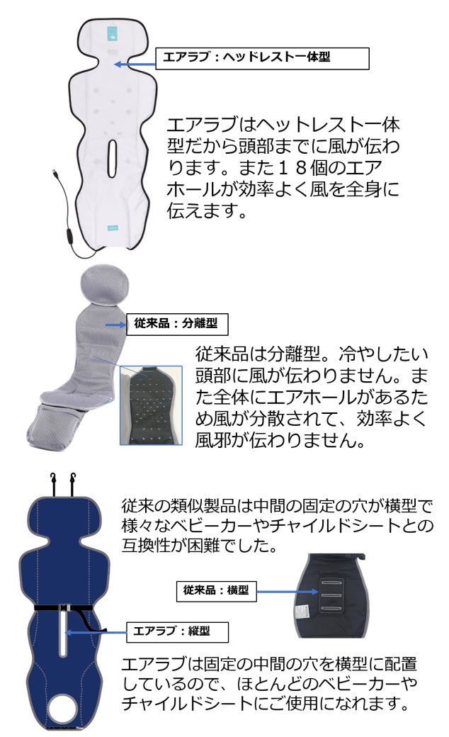 さらに、エアラブはヘッドレストとシートが一体設計ですので、お子さまの頭部や首の部分にもしっかりと風を運びます。