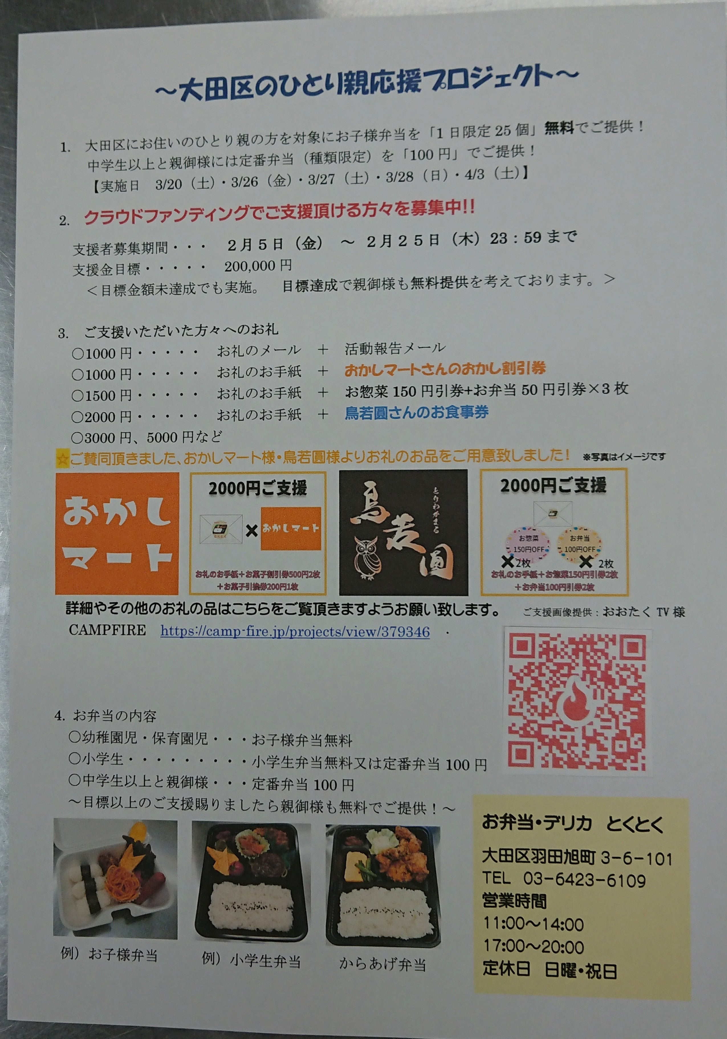 ご支援本当にありがとうございました。なかなか認知度があがらず、ご来店頂ける方々がまだまだ少なく申し訳なく思っております。そのなかで、ご来店頂きお写真も了承していただけ、さらに「ありがとうございます!」と元気いっぱい言って頂けると本当に本当に涙がでる程嬉しいです。あと1日ですが、来て頂いたお子様に笑顔になって頂けるよう全力でお弁当をつくります!最終報告を4月10日までには皆様にメール等でお伝えできたらと思っております。あと少し、よろしくお願い致します。