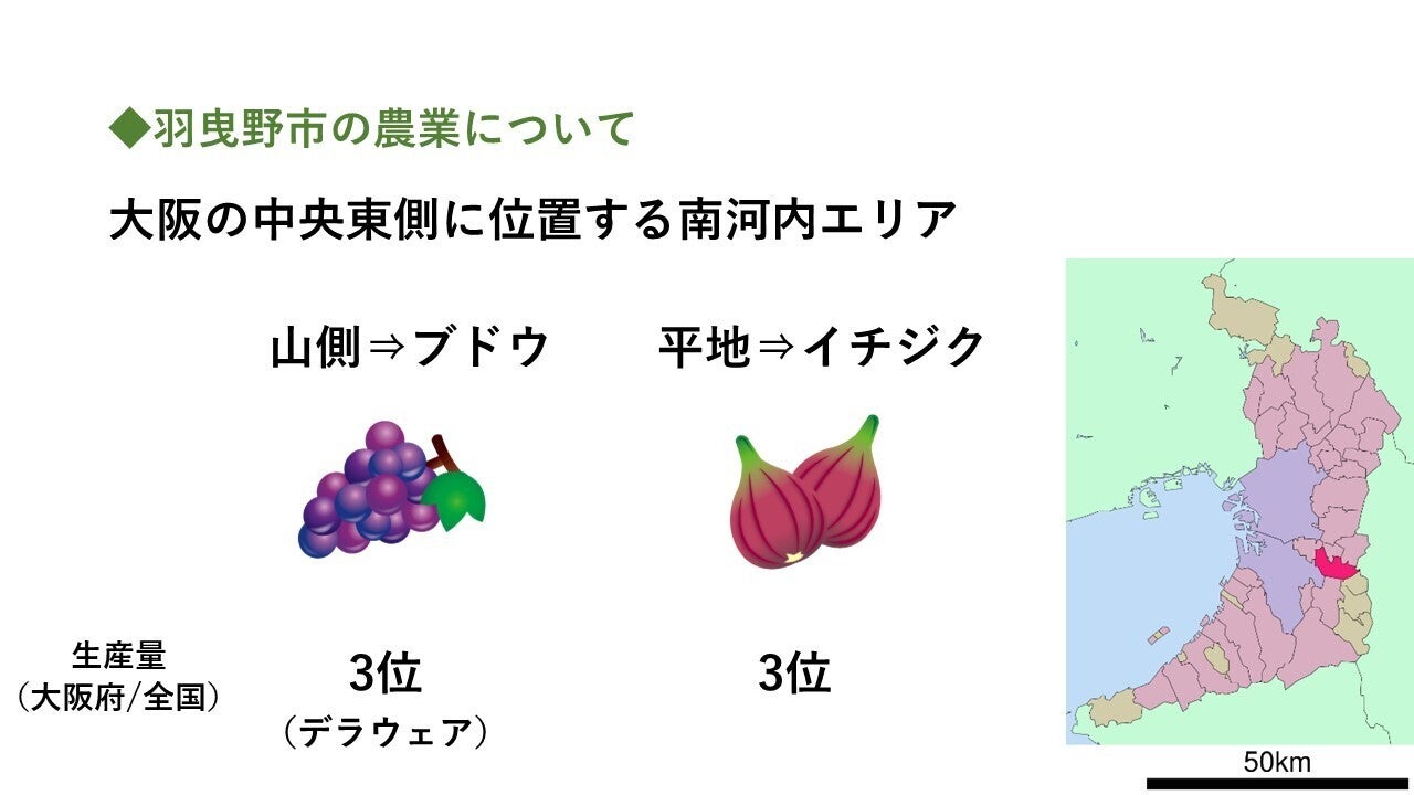 羽曳野市では、山側ではブドウ、平地ではイチジクが主に栽培されています。