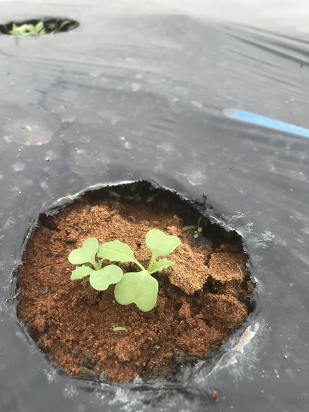 返礼品のひとつ冬野菜セットのカブも芽吹いて、かわいい双葉と本葉(ギザギザの葉)が出てきました。周りに見える茶色い粉は、奈良県吉野の発酵ヒノキパウダーです。林業で発生したヒノキパウダーを、微生物によって発酵させた、こちらも循環型の資材です。このヒノキパウダーを入れることによって、土壌微生物のエサともなり、多様性が生まれます。特定の病原菌が増えるなどの偏った環境になることを防ぎ、自然と美味しいとろけるカブに仕上がります。ハッピーファームのカブは発酵ヒノキパウダーで、山から畑へ、そして人へと循環する農産物の一つです。冬野菜セットをご支援いただいた皆様、どうか発送までもう少しの間、お楽しみにお待ちください!