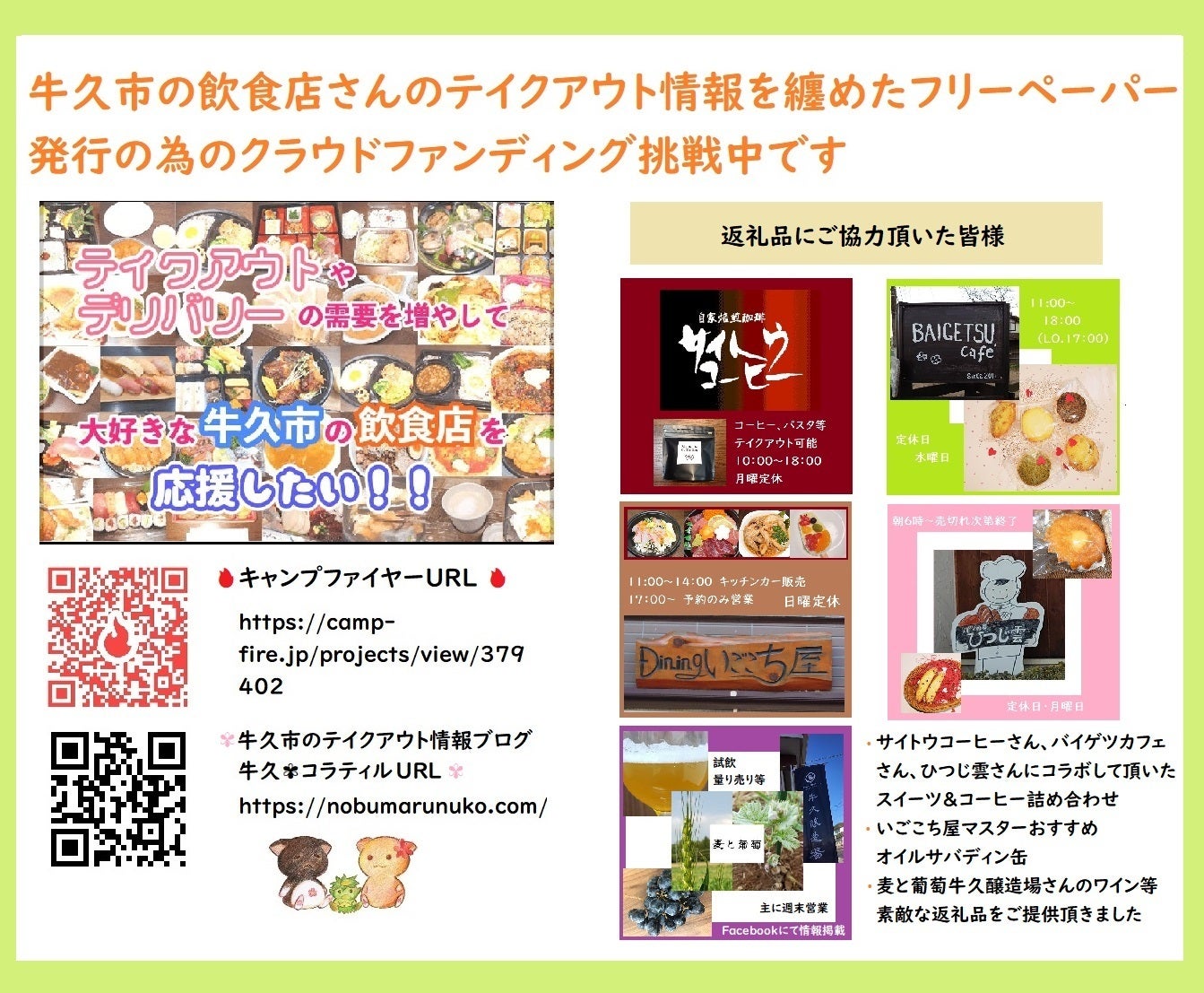 18日と短い期間ではありますが、自分の出来る限りを尽くして拡散、テイクアウトを牛久の方々に知っていただけるよう頑張っていきたいと思っております。