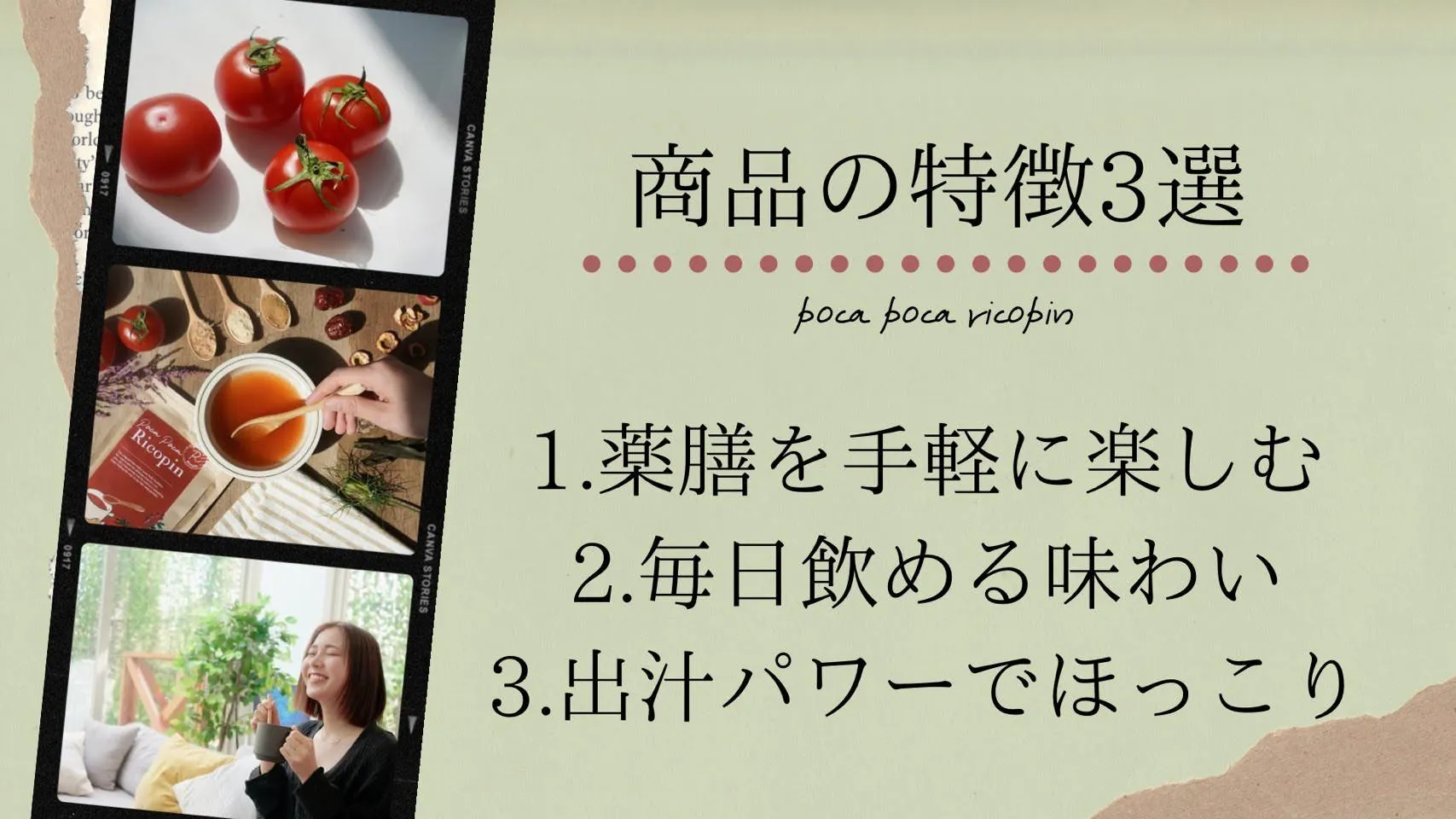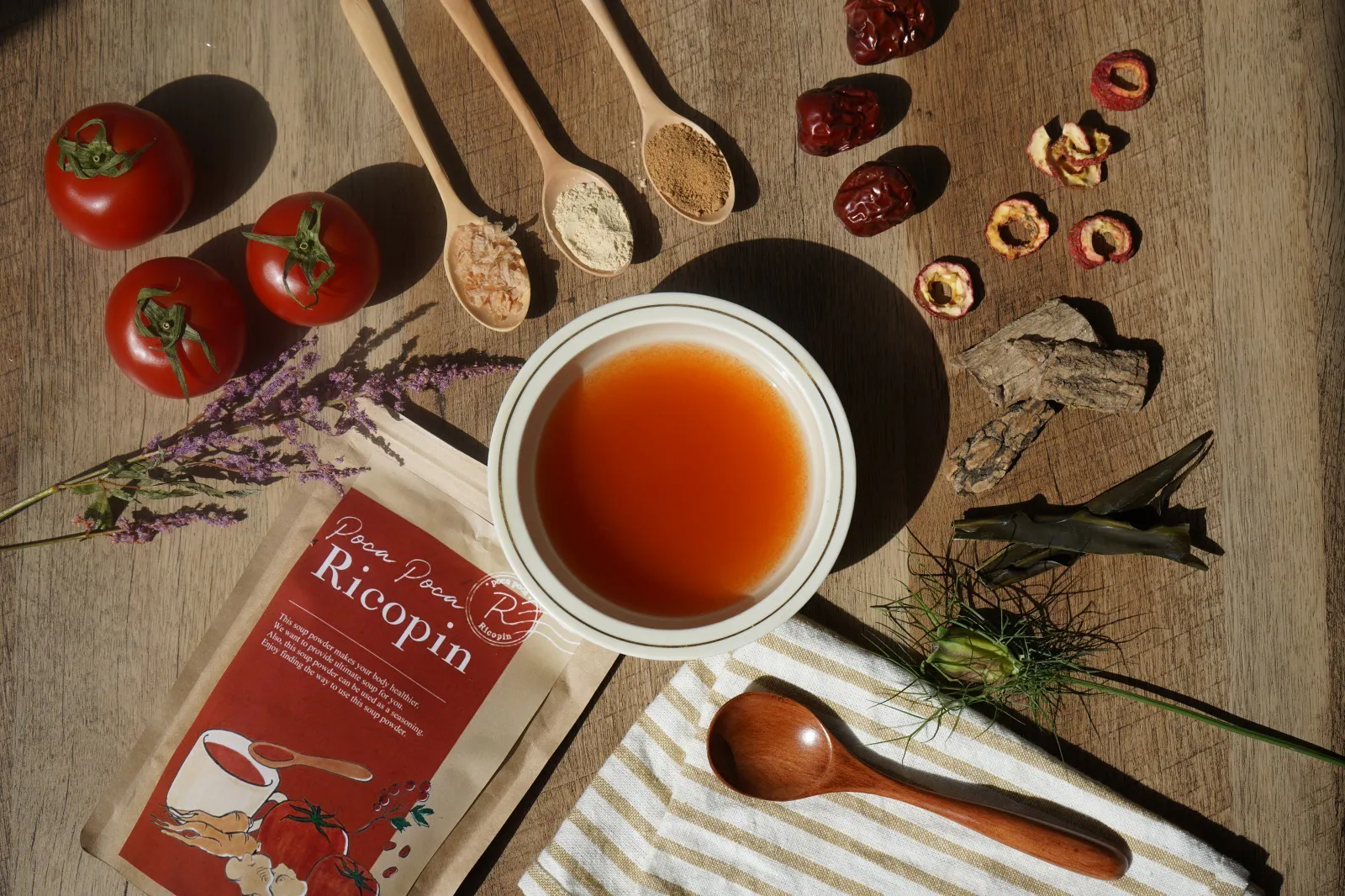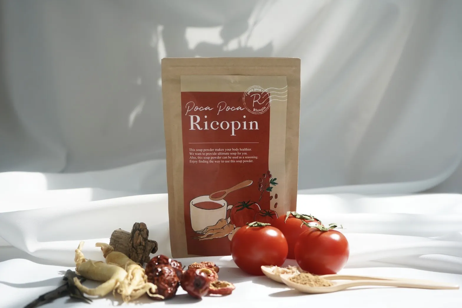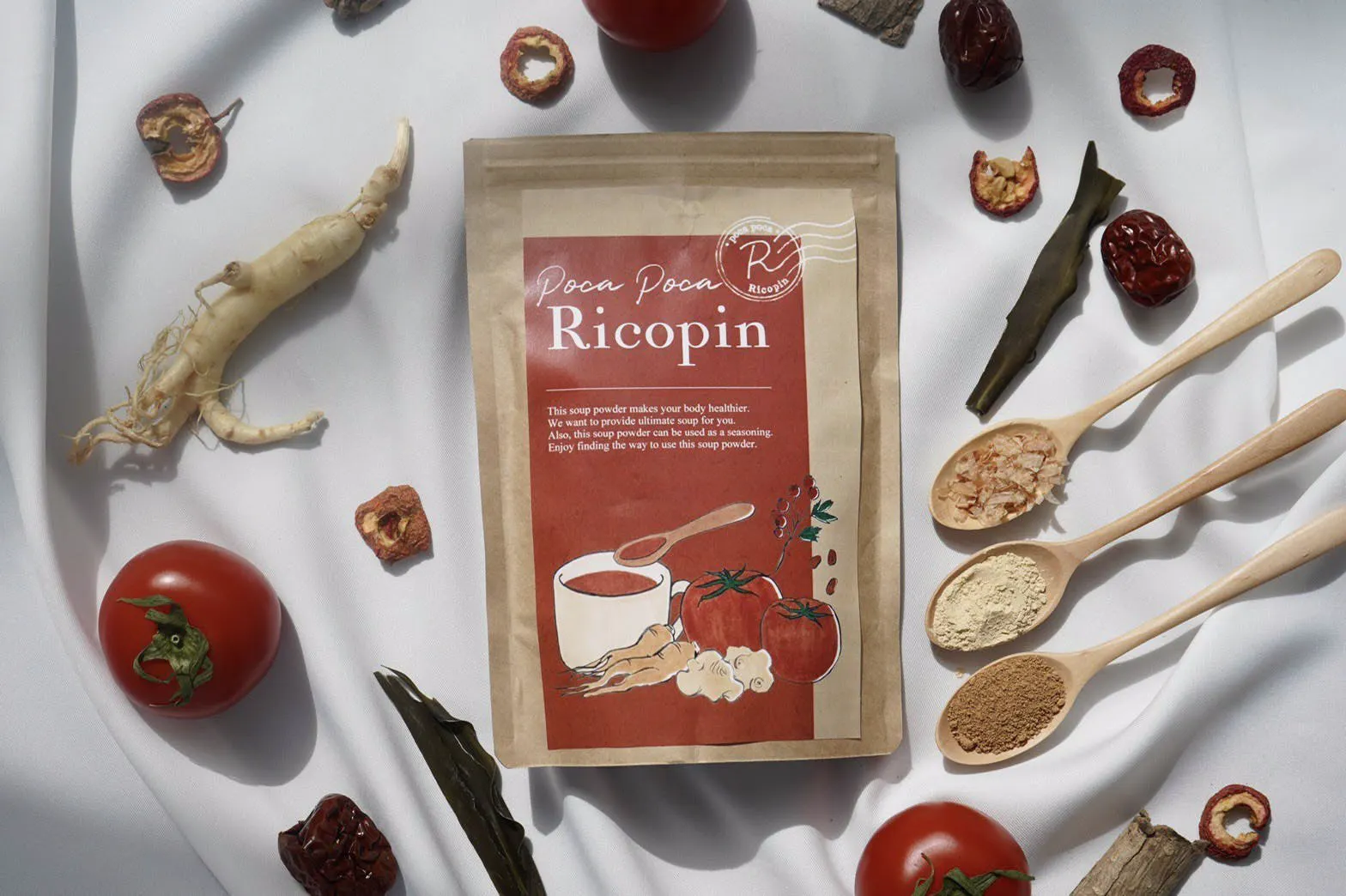 ストレスの多い毎日でほっと一息つける、そして日々の健康と美容をサポートする商品であるトマト薬膳パウダー『poca poca Ricopin』をぜひみなさんの生活に取り入れていただきたいです。