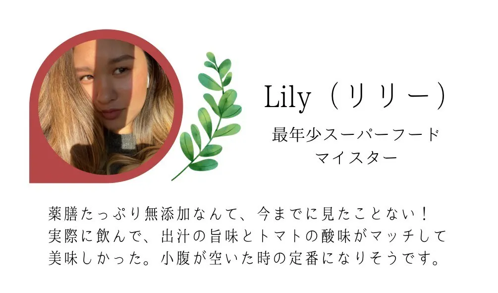 トマトパウダーをベースに、忙しい人達に取り入れてほしいなつめ、高麗人参、菊芋、山査子、杜仲茶の5つの薬膳をブレンドしました。