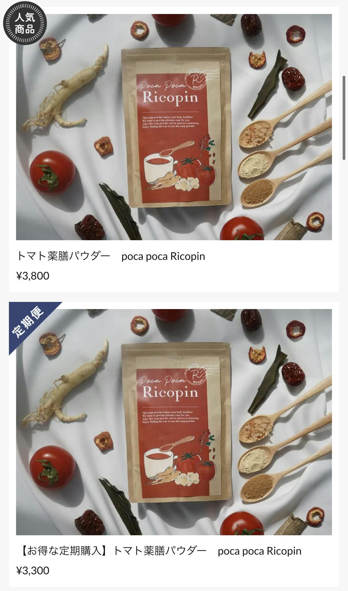 トマト薬膳パウダー「poca poca Ricopin」1袋と、トマト薬膳パウダーを使った