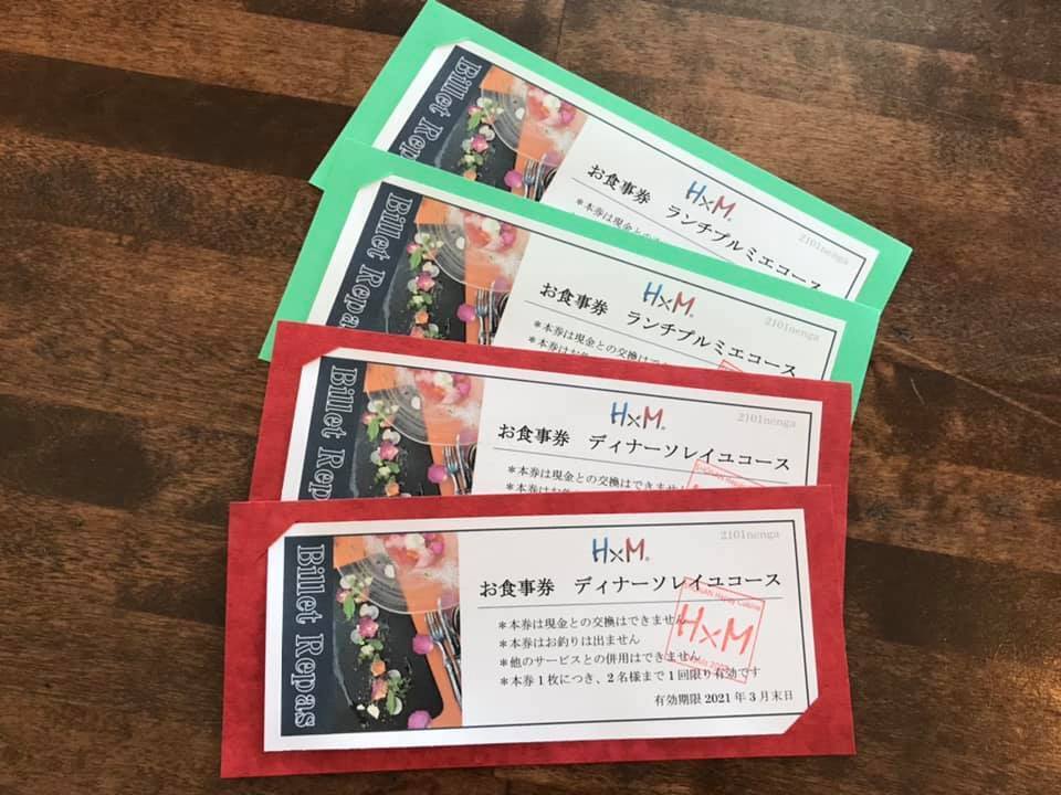 ◆アッシュ×エム、ONE共通 11,000円分のお食事券+グラスワイン券2枚