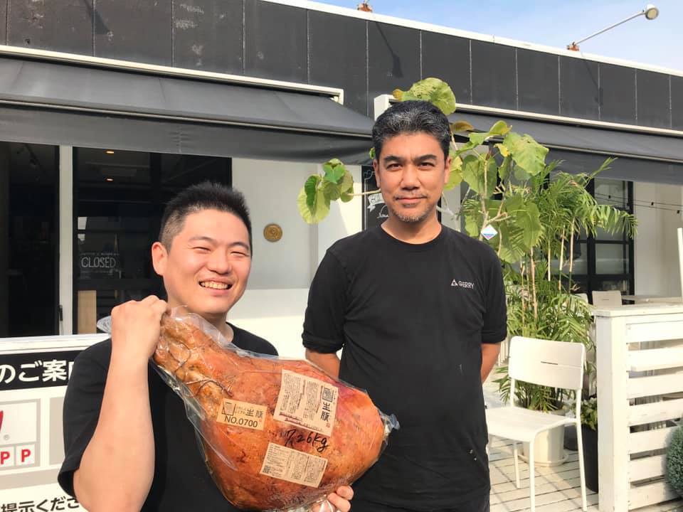 ふじさわ生豚(生ハム)を作る高橋さんとシェフ