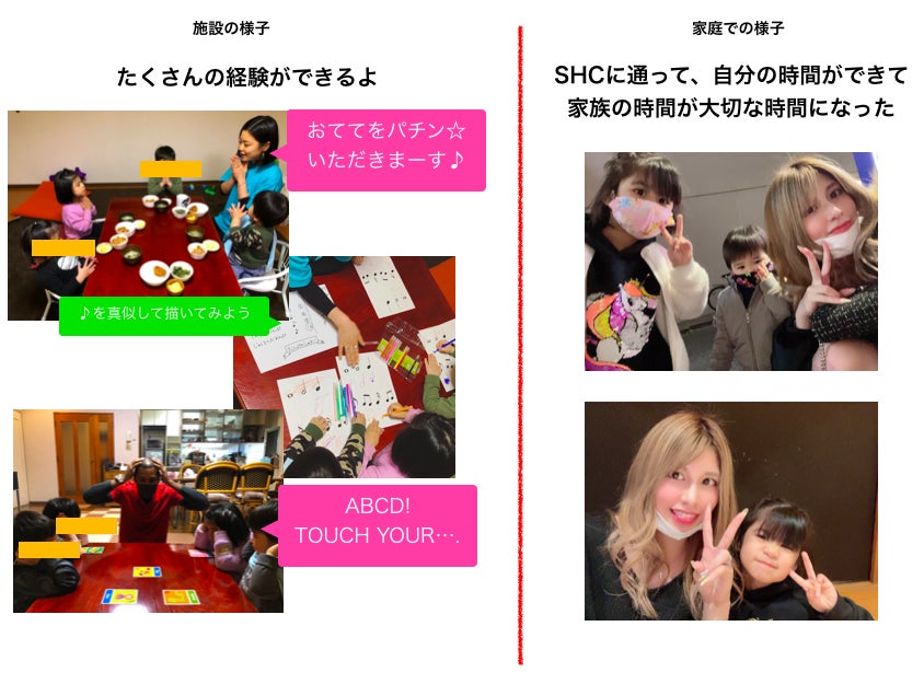 また、一人で頑張っていた母子家庭や父子家庭の親御さんもSHCの存在でスタッフに相談し、一緒に頑張っていくことも一人ではないという心の支えになって、健康で幸せな環境を目指します。