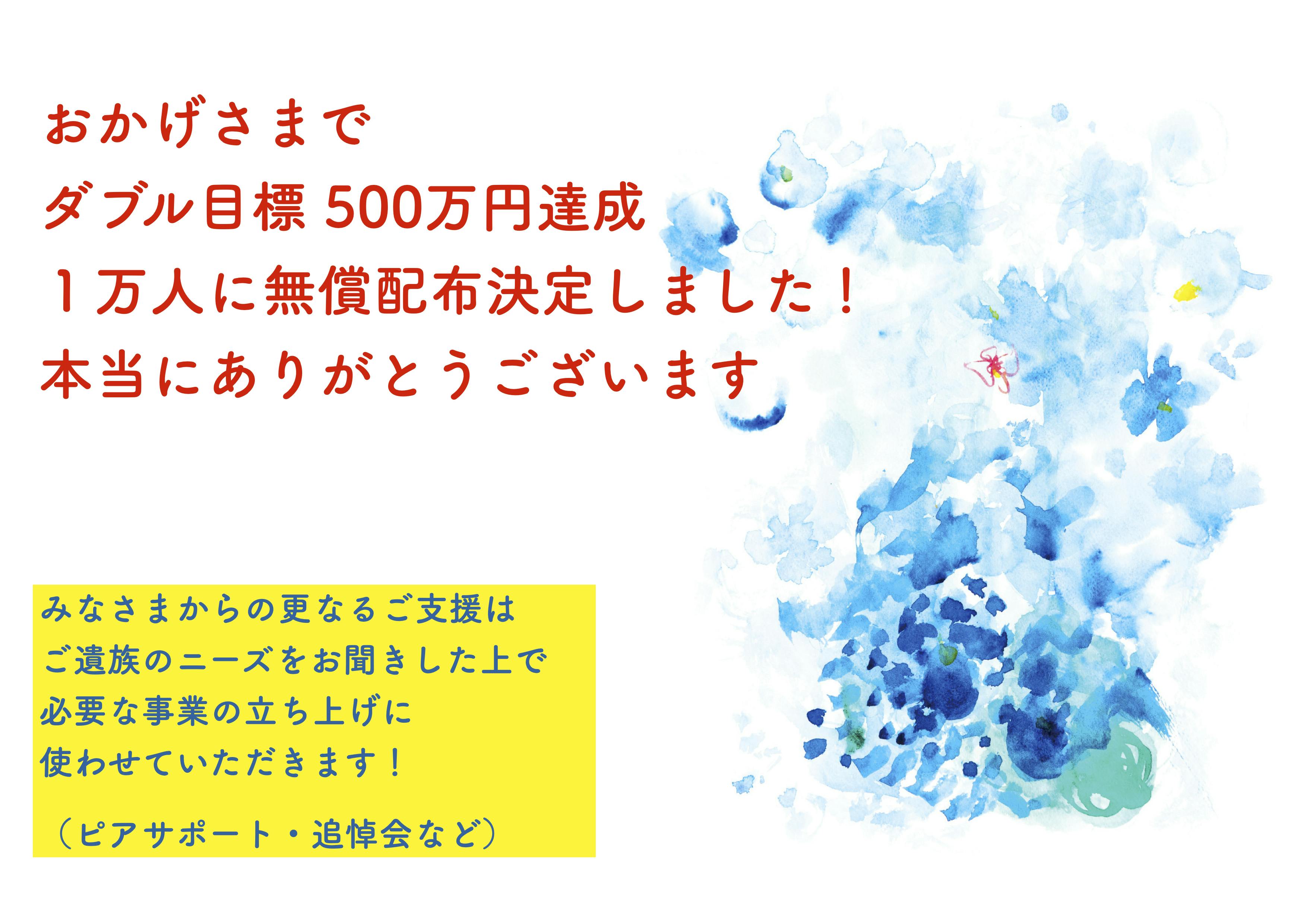 これにより、1万人(件)、ご遺族をはじめとし、医療機関、葬送関連業、宗教者の方々に無料でお届けできます。必要とされる方のすぐ手元に届くように、みなさまこの書籍の広報にもお力添えいただけたら幸いです。(必要とされているご遺族への案内、医療機関などの紹介etc.)