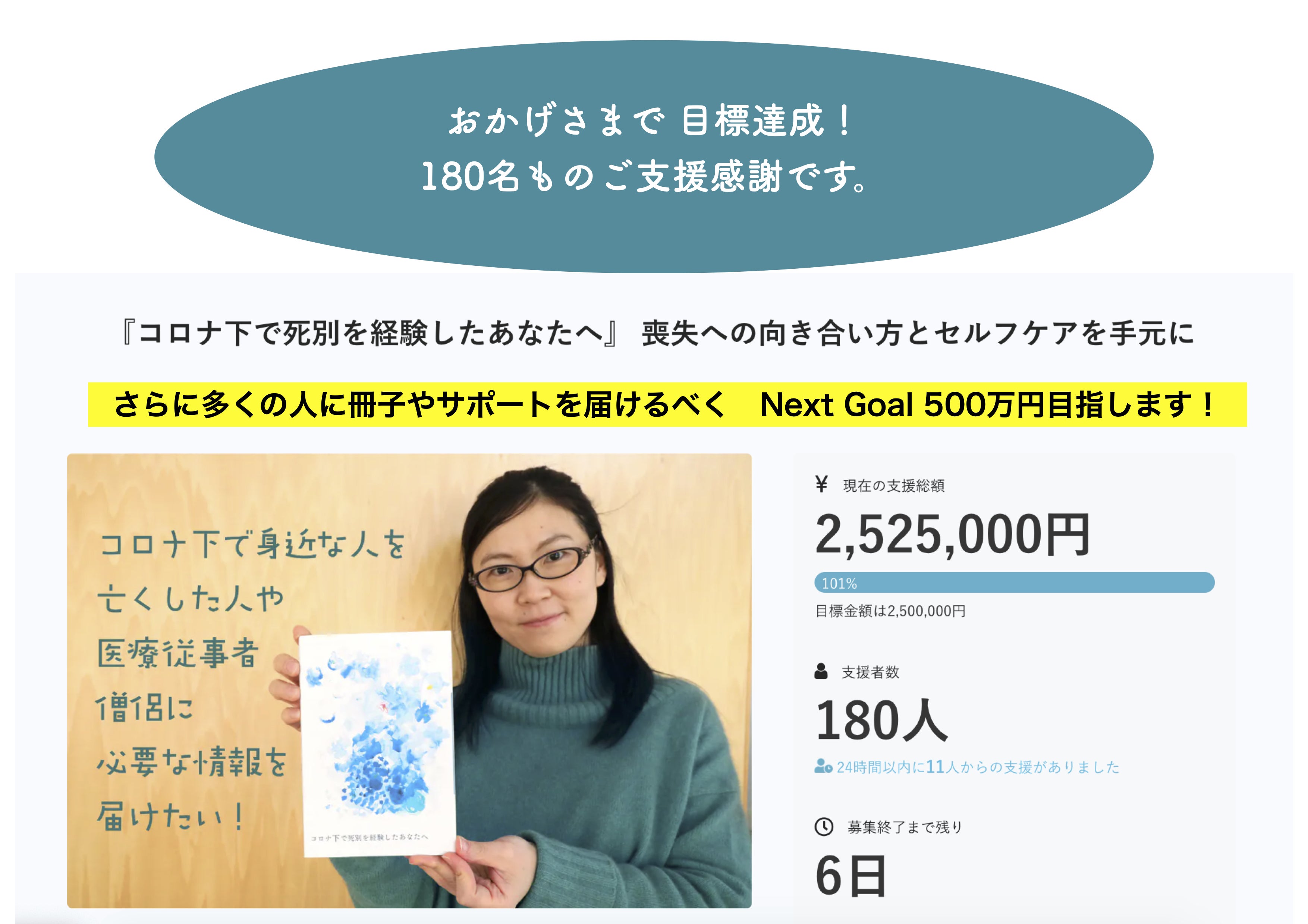 いよいよ、残り2日となりました。リヴオン代表の尾角光美(おかくてるみ)です。社会起業家の先輩、SALA SUSUの 代表青木健太さん が去年、わたしを呼んでくださり「新型コロナ下におけるグリーフケアやサポート」についてお話した会の音声を起こしてくださいました。ぜひご一読いただけたら嬉しいです。SALA SUSUは、カンボジアの農村で教育の機会に恵まれなかったり、小学校にもいけなかったりした女性たちに、ものづくりのしごとを通じて、人生の歩みを伴走するような、素敵なブランドです。クラウドファンディングにはじめて挑戦して思うのは「資金を募り、応援してもらう」ということを越えて、これまでつながっていた人たちが改めて「なにかできることある?」「リターンでこんなの考えてみた!」とか「記事にしてみんなに届けるよ」とか「自分ごと」のようにこの企画を共にしてくれることでした。ありがたくて。ありがたくて。昨日は、2年ぶりくらいに、電話かけてきてくれた友人が、お母様をコロナの状況下でお見送りしたため、儀式にたくさんの人を招くことはできず「『なんでこんな寂しいお葬式しないといけないんだろう』と思った。だから、今回の企画を応援したいんだ!」と伝えてくれて、さみしくて悲しいけれど、本当にありがたかったです。あと2日。ネクストゴールに掲げた500万円達成まで、精一杯がんばりたいので、みなさん最後まで引き続き、お供していただけたらと思います。