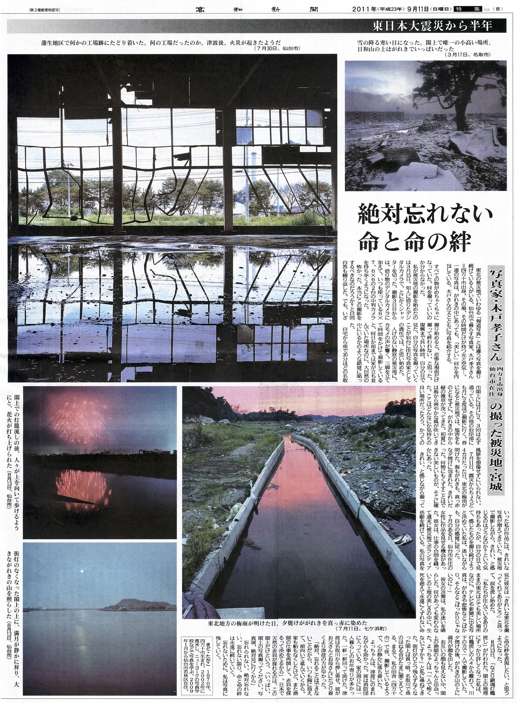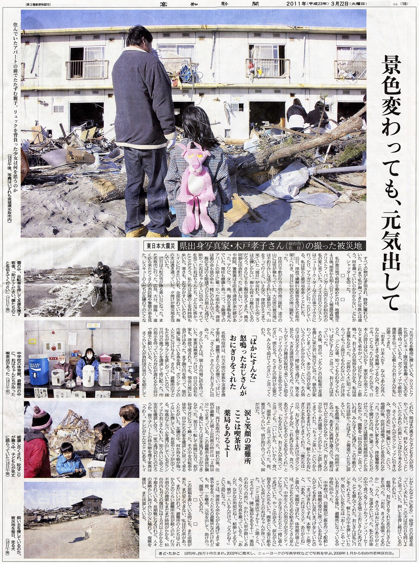 みなさま、はじめまして。お久しぶりの方もいらっしゃると思います。写真家の木戸孝子です。高知県出身で、2002年にニューヨークへ渡り、インターナショナルセンターオブフォトグラフィー(ICP)で写真を学びました。2008年、帰国。2009年から、夫の故郷の仙台市に住み始めました。日本での生活に奮闘していた2011年3月11日に、東日本大震災が起きました。