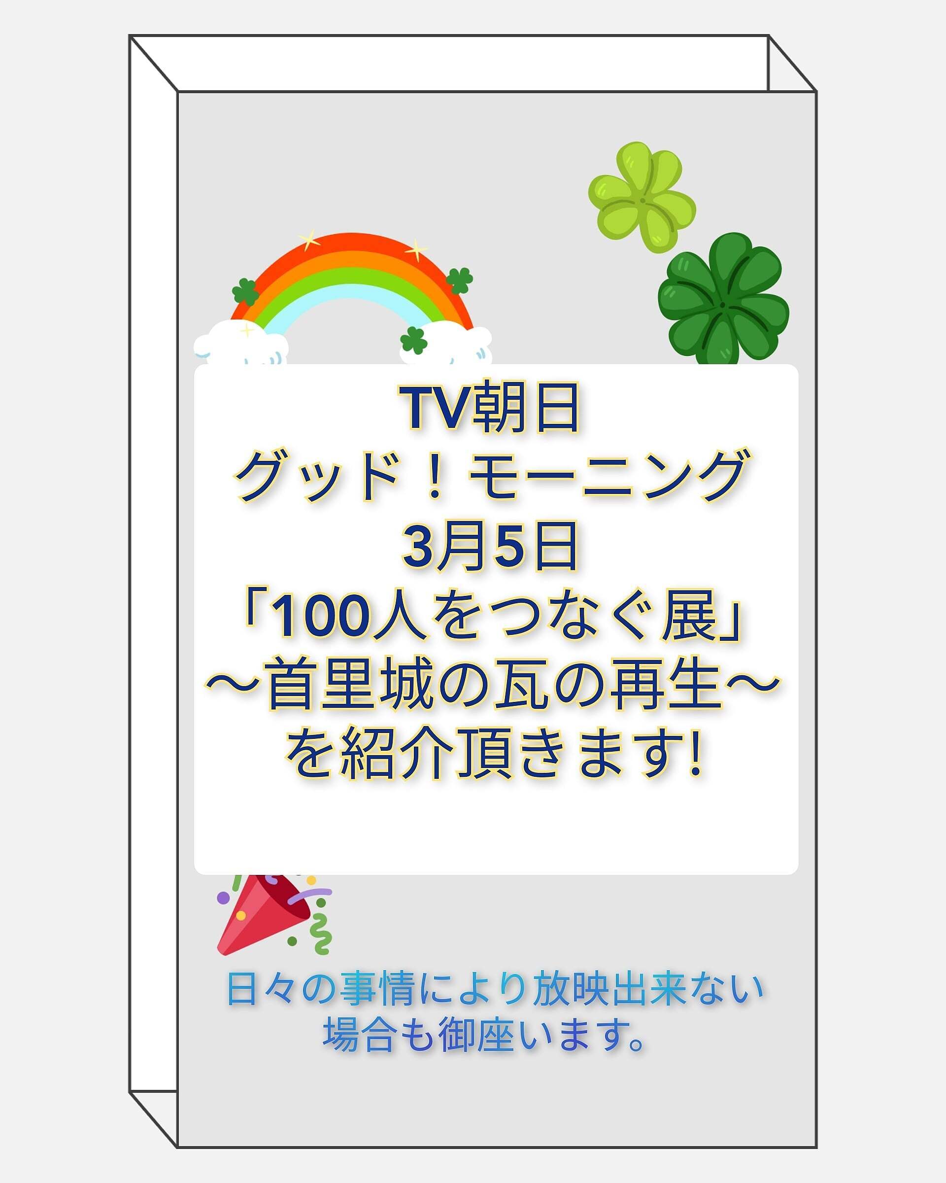 世界遺産首里城復興プロジェクト「100人をつなぐ展」〜首里城の瓦の再生〜TV朝日グッド!モーニング3月5日にご紹介頂きます!是非ご覧下さい!#日々の事情により放送されない場合も御座います