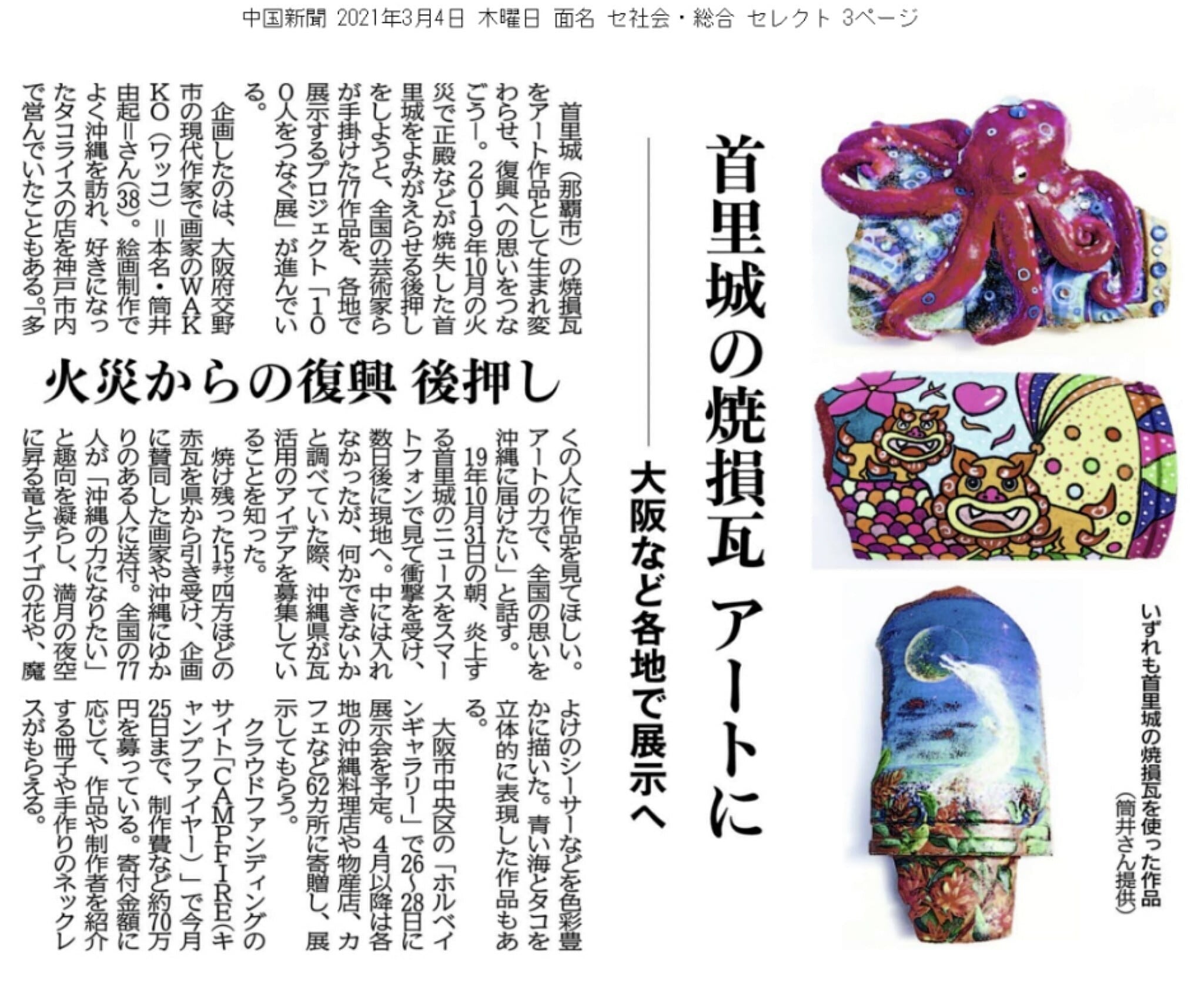 世界遺産首里城復興プロジェクト「100人をつなぐ展 」〜首里城の瓦の再生〜河北新報3月4日 夕刊掲載して頂きました