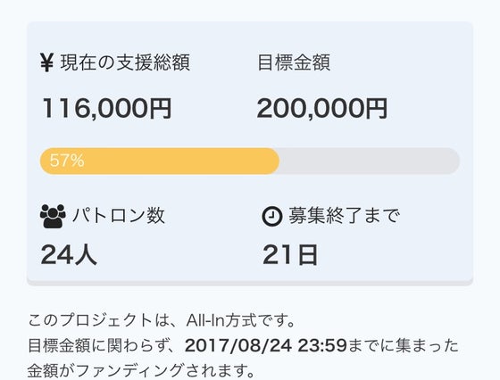 2017/08/04 00:3215時に公開しました今回のプロジェクト! なんと初日から50%越え!!! 本当にありがとうございます!! 今回は以前と比べて期間が短いので、お早めの参加をお願いしております。 残暑見舞いも先着となります! 引き続き宜しくお願い致します!! もっと見る