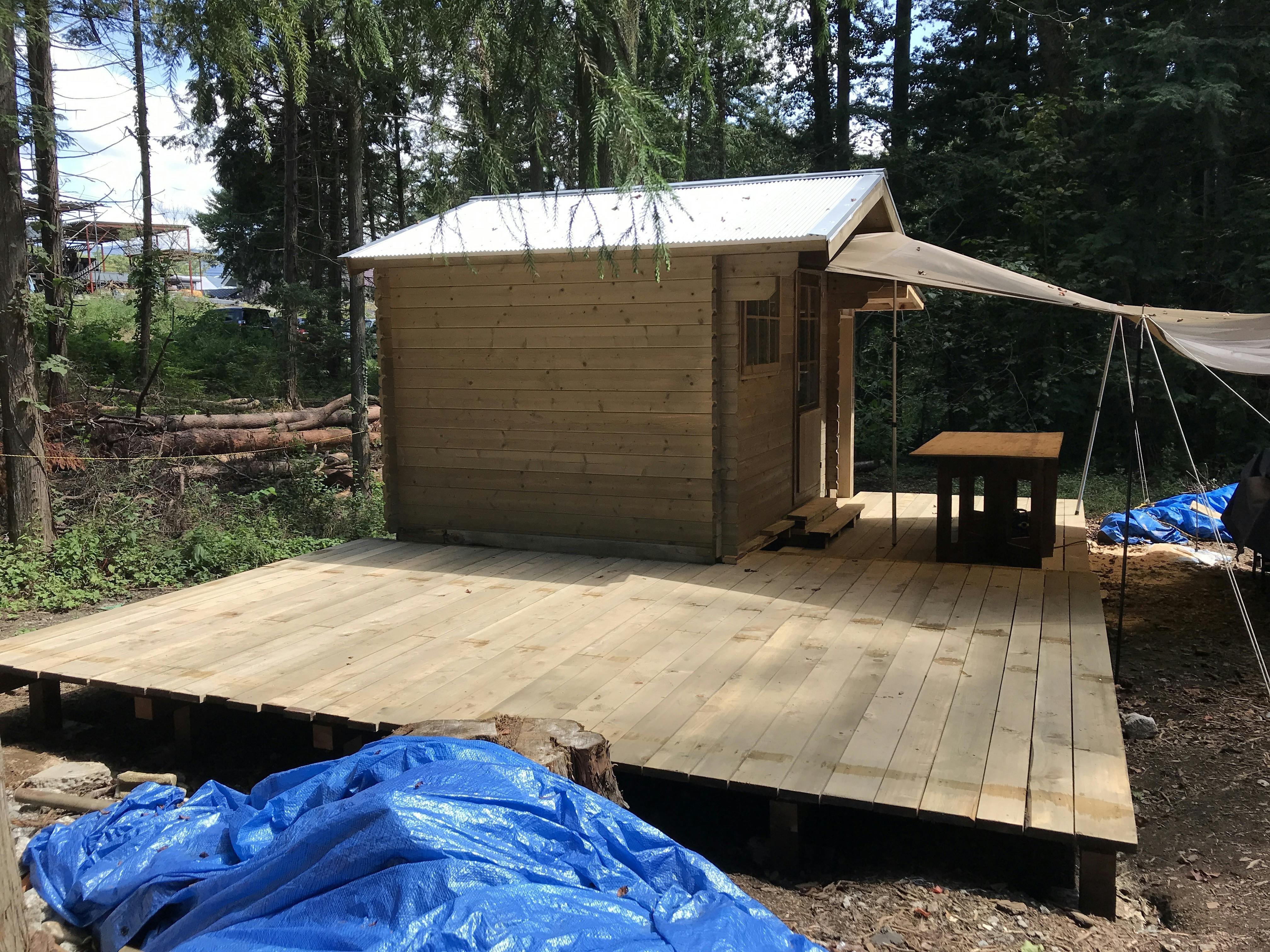 2021/09/15 20:31皆様の応援を得て、「憩いのオアシス」の拠点として6月から作ってきたあそびのもりの小屋。たくさんの方のサポートをいただきながら、ついにウッドデッキの完成です♪このウッドデッキの床材は、手前の大きな切り株のさわらからとったものです。枯れ始めたさわらの木を切り倒して使える部分だけを材にしていただき、こんなに立派なデッキが完成しました!いわばさわらの里帰り。今までと形を変えてこのあそびのもりを見守ってくれることになりました。さわらやヒノキの香りがして、とても気持ち良いスペースです。今後はこの小屋にトイレスペースのドアがついて(バイオトイレまでは、残念ながら届きませんでした)、先日は電柱が立ったので、今月中には電気の引き込み及び電気工事も完了する予定です。またおいおいご報告いたします!お楽しみに。 もっと見る