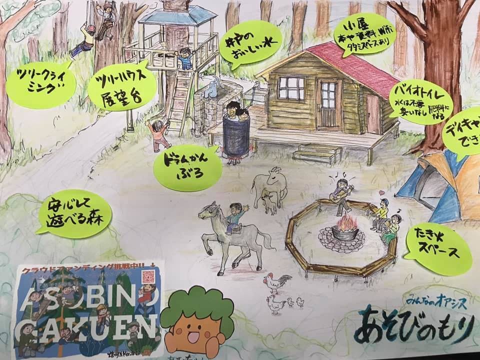 このクラウドファンディングを達成することで、生まれる心のオアシス「あそびのもり」が、どんな姿になるのかを、描いてみました。