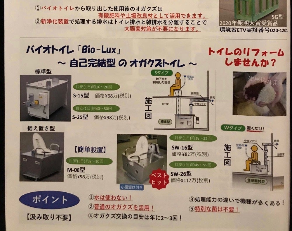 ・バイオトイレは、水分率の高い糞尿の水分を「臭いを出さずに蒸発させる」為に、普通のオガクズを使います。便槽に充填したオガクズに水分を保水させ、加温し、スクリュー撹拌する事で「水分を効率的に蒸発」させる事が出来ます。水の環境問題や水質の汚染問題、水不足や断水問題等の課題を向上させます